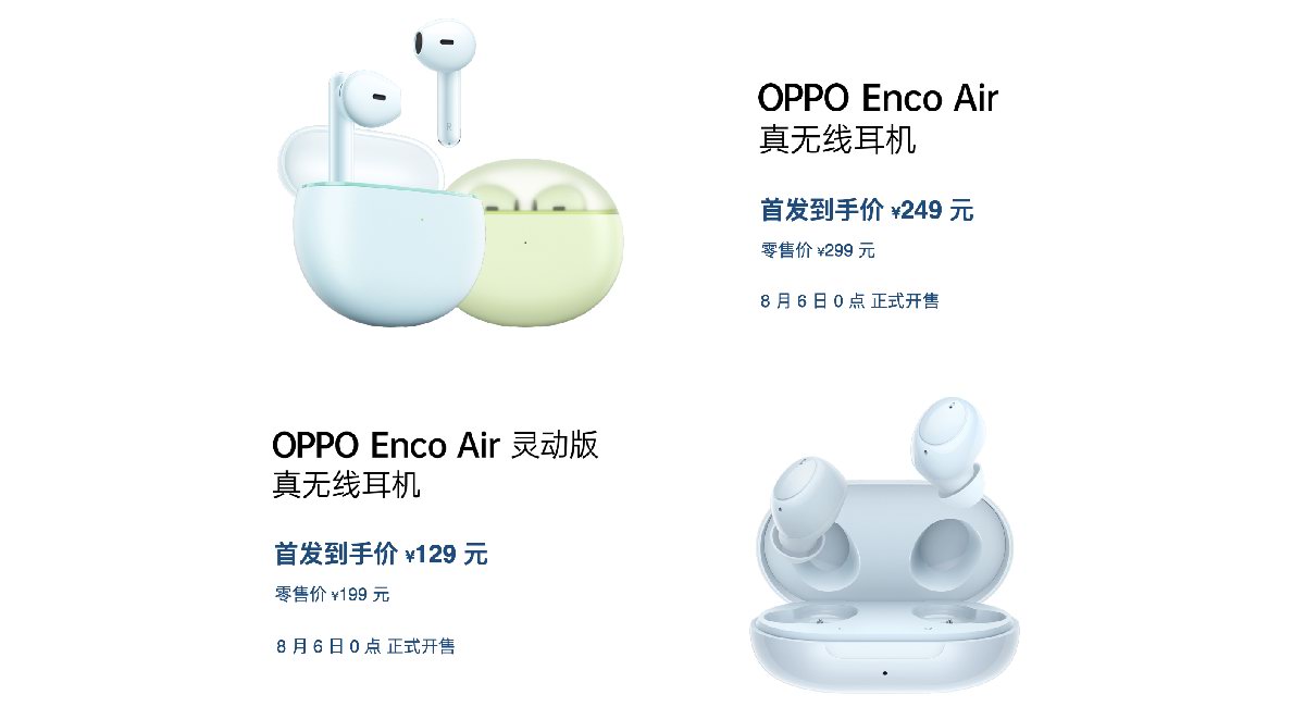 除OPPO Watch 2外, 这次OPPO还带来了OPPO Enco Air真无线耳机的青/蓝新配色,两款新配色售价同为299元,首销期间入手仅249元。OPPO Enco Air灵动版淡蓝版,售价199,首销期间入手仅129元。