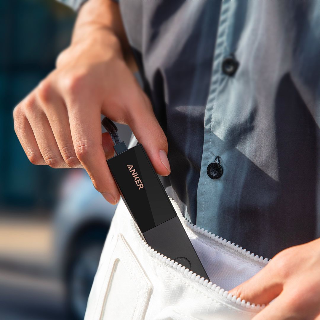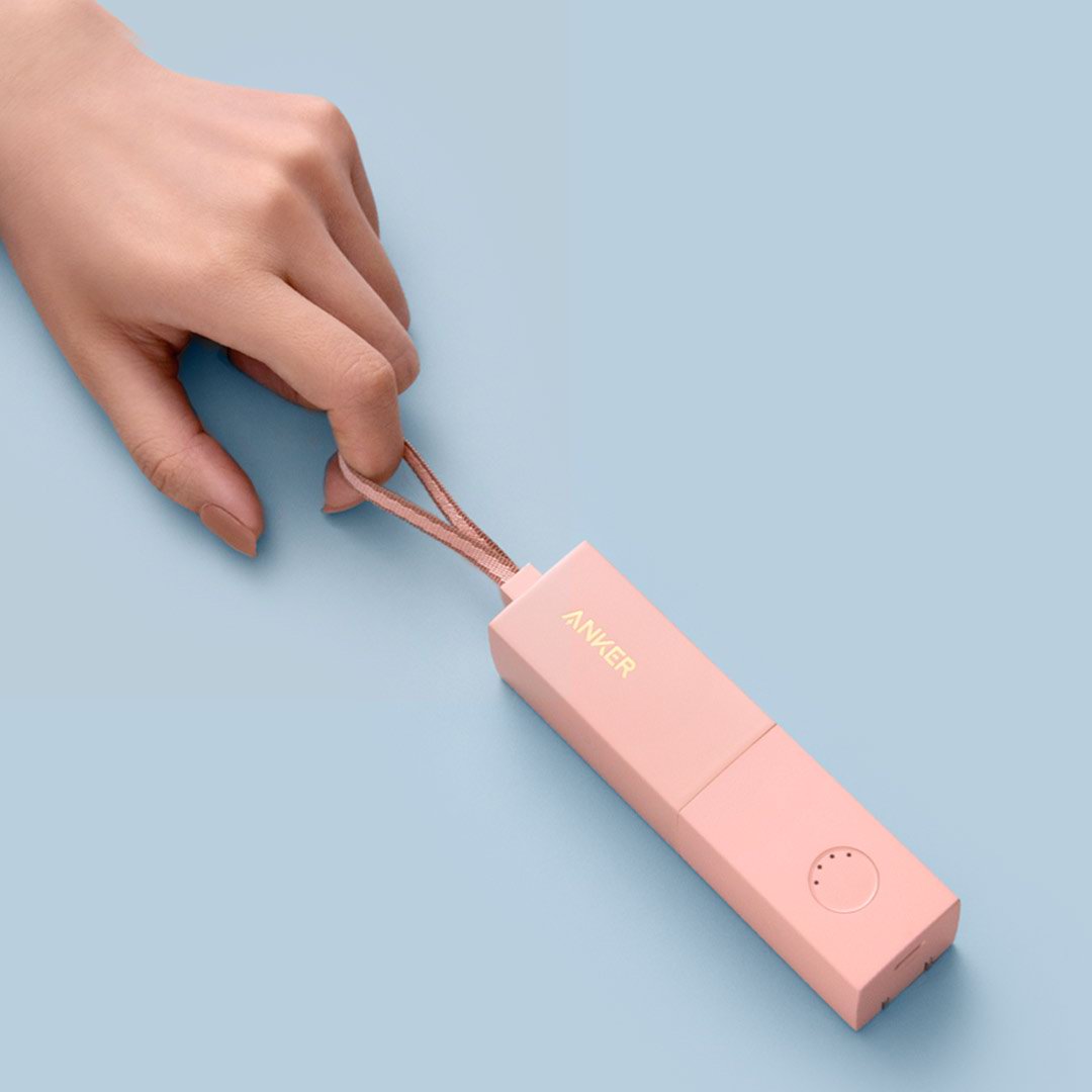 Anker口红超极充的口红造型设计使它能轻松的被收纳进包包,它的三围尺寸仅113*30*30mm,重量也只有170g,放入包包不会觉得突兀,并且它小巧轻便,不占用空间。同时,它的顶部还加入了精编手绳设计,更方便用户取放携带。