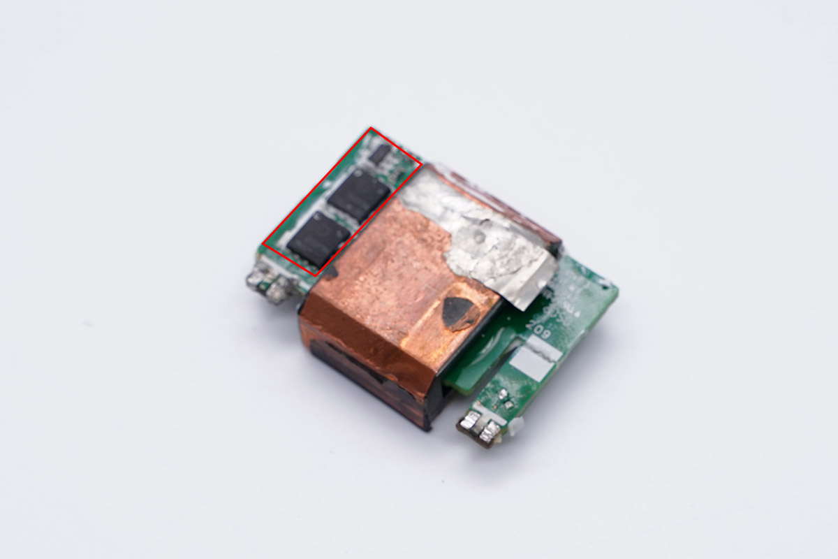 平面变压器外面包裹铜箔屏蔽层。这部分电路由意法半导体的氮化镓芯片驱动实现降压,同时次级侧还设置了同步整流电路。