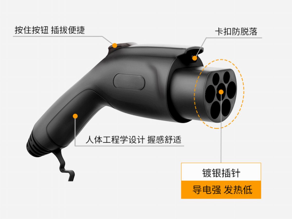 充电枪车端枪头采用人体工程学设计,握感舒适便于拿起,顶部带有锁扣与释放按钮,插入后牢固锁定防止充电过程中意外脱落,枪头内用于传输电力的插针采用镀银工艺处理,阻值低导电性能强,并有效降低大功率充电时的发热。