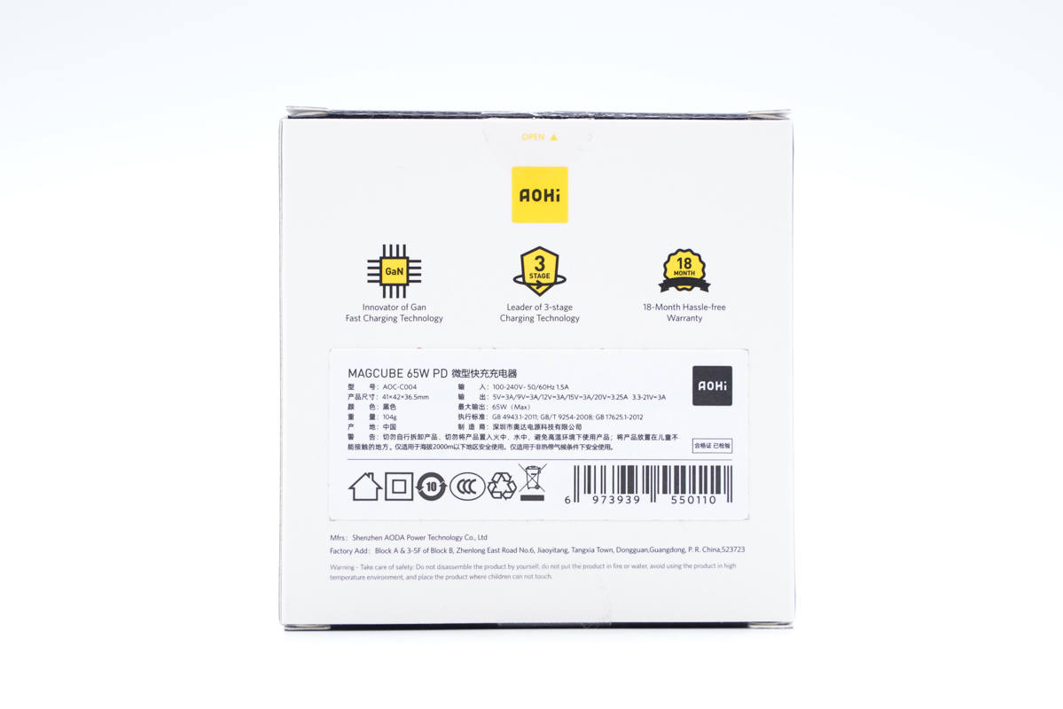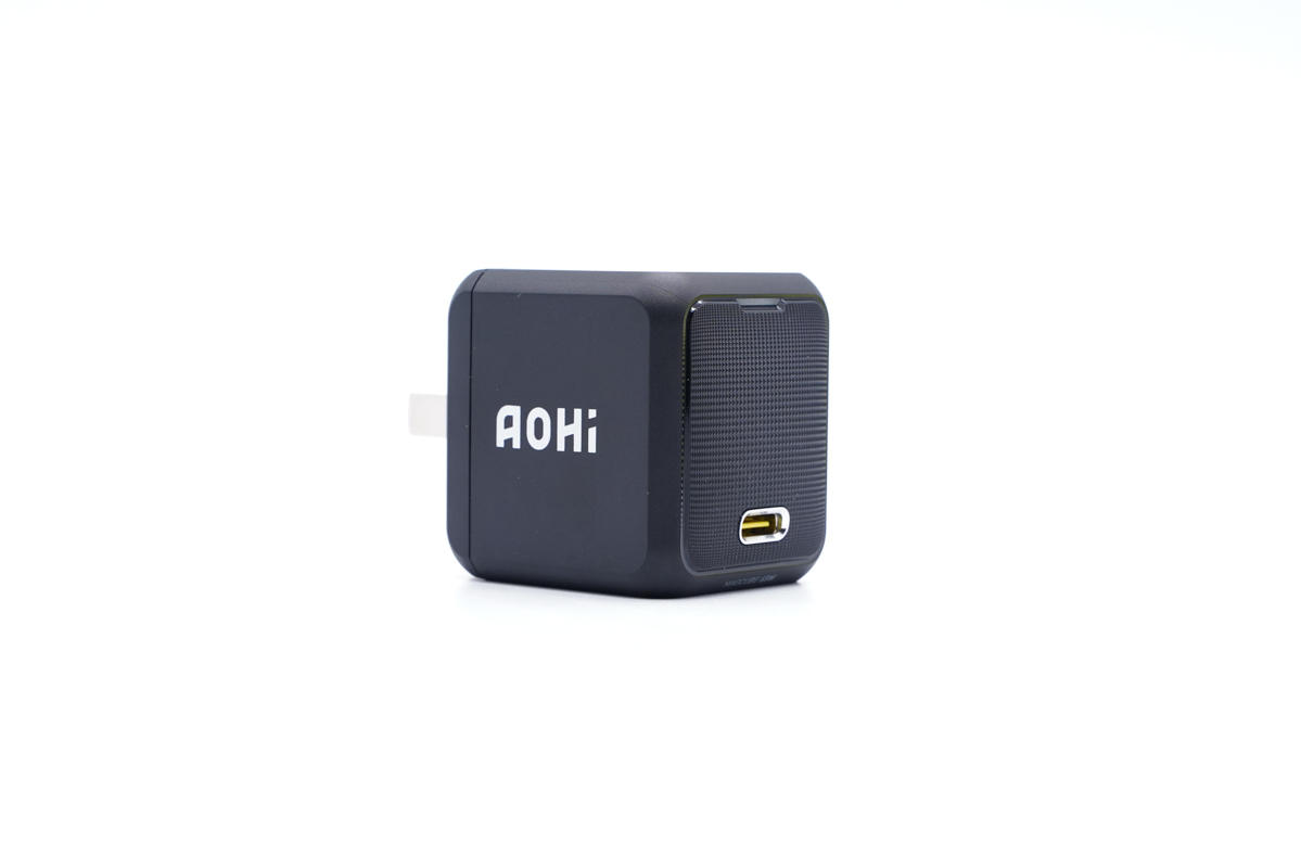 作为Magcube系列又一款充电器,产品包装盒设计风格没变,正面印有Aohi品牌、充电头外观图和名称。