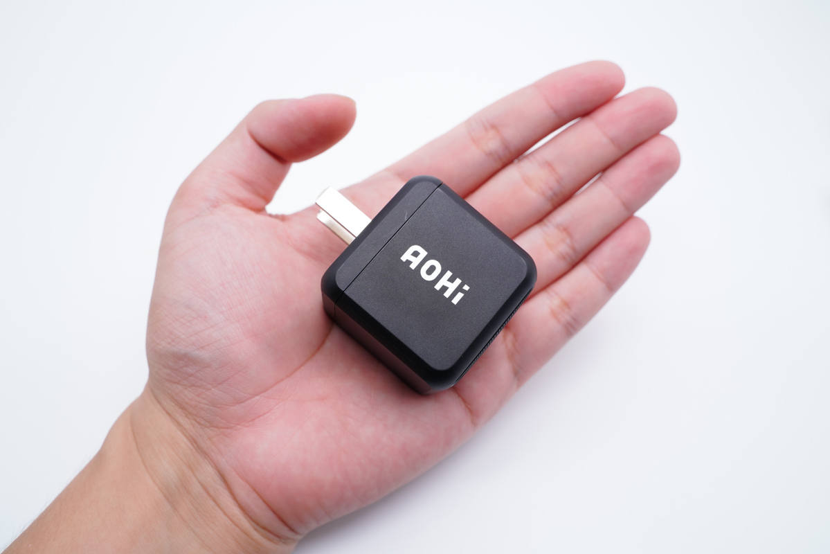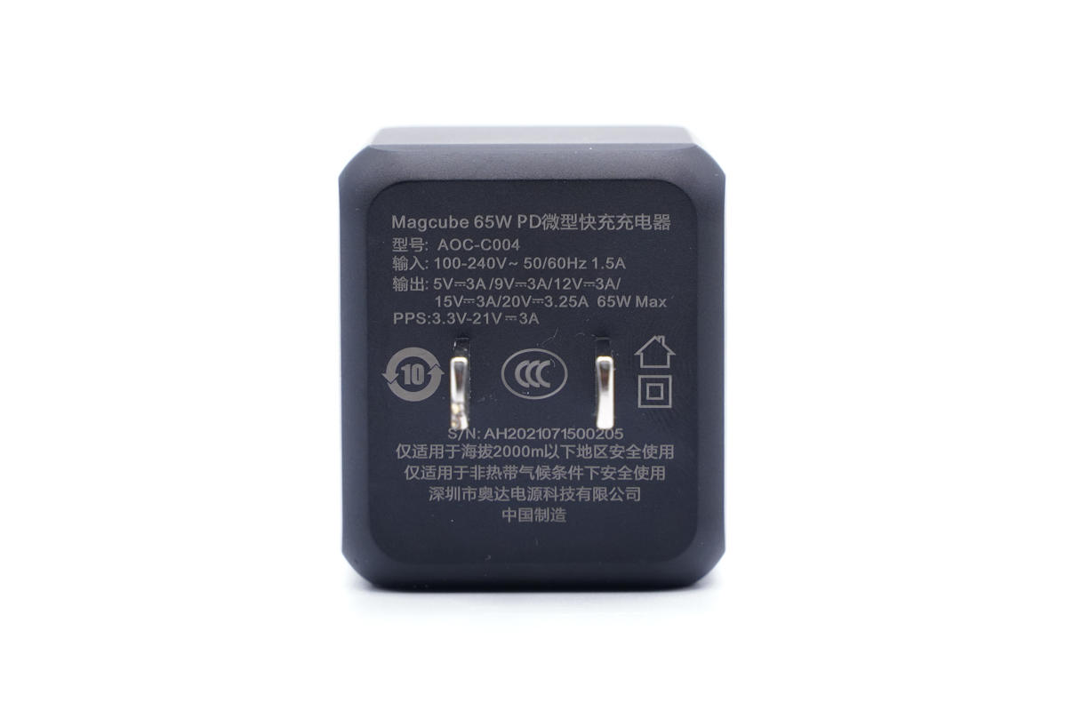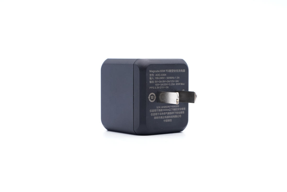 Aohi这款65W氮化镓充电器外观延续Magcube系列风格设计,方块造型,机身边角倒角设计,整体来看,就像是大一点的Magcube 30W氮化镓迷你充。