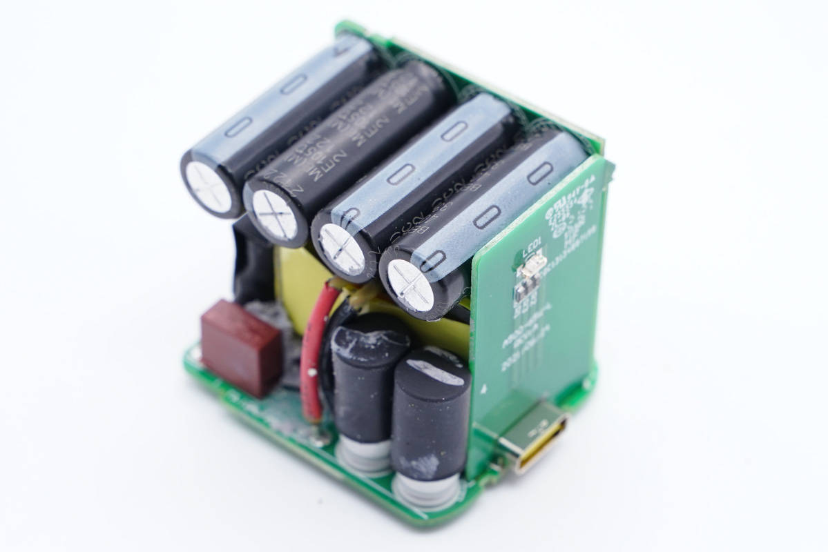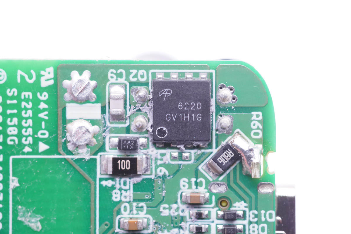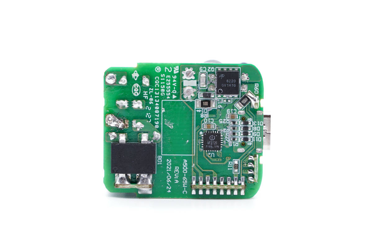 Aohi这款65W氮化镓充电器采用业内知名大厂PI的INN3370C主控搭配万代AON6220同步整流管组成高频QR开关电源,协议芯片采用英集芯热门产品IP2726。电解电容和固态电容均来自知名品牌绿宝石。充电器做工用料扎实可靠。