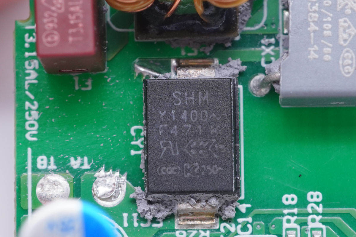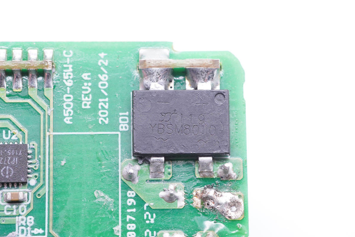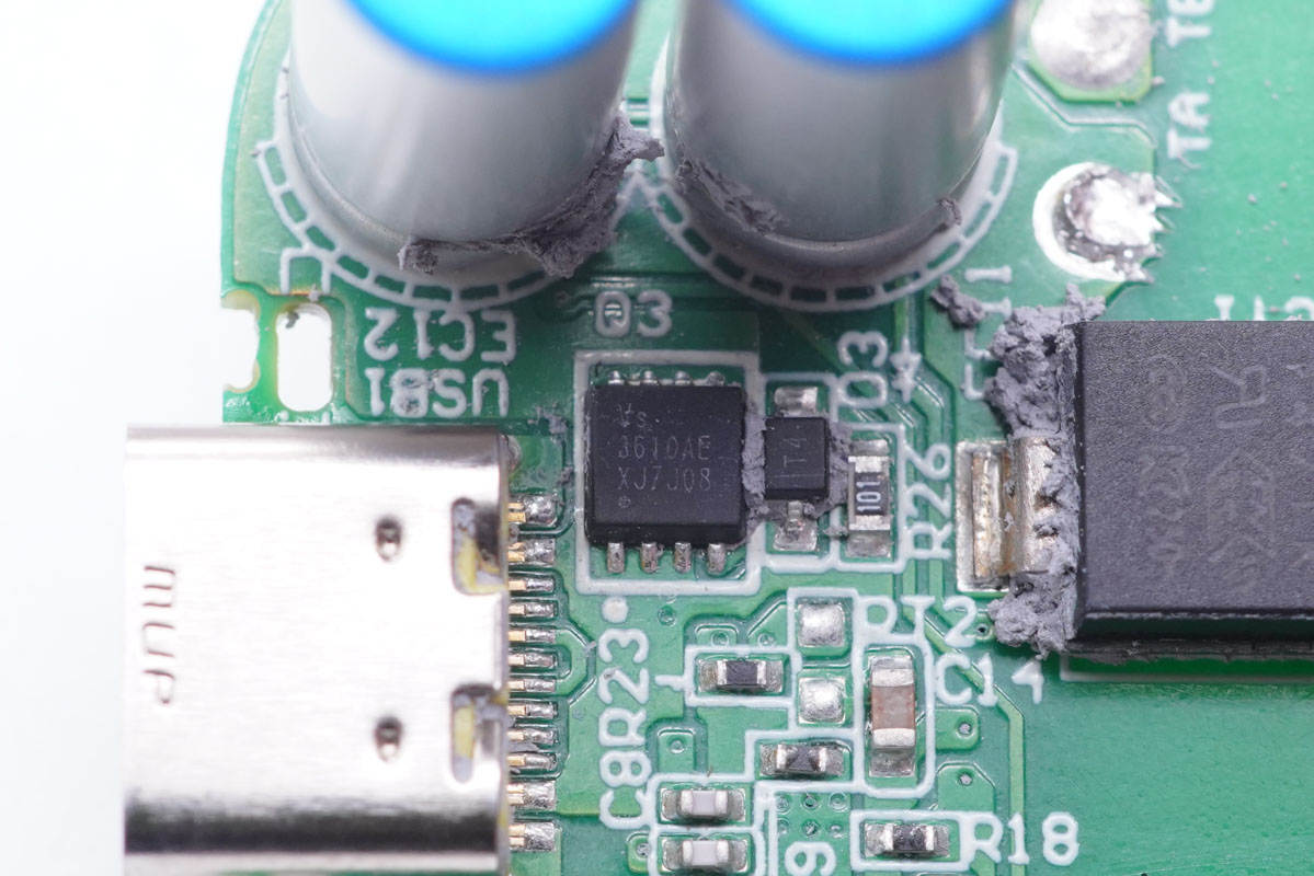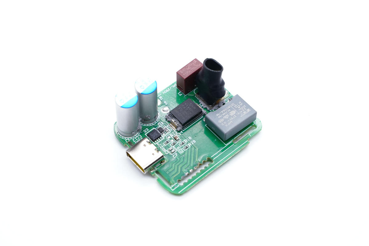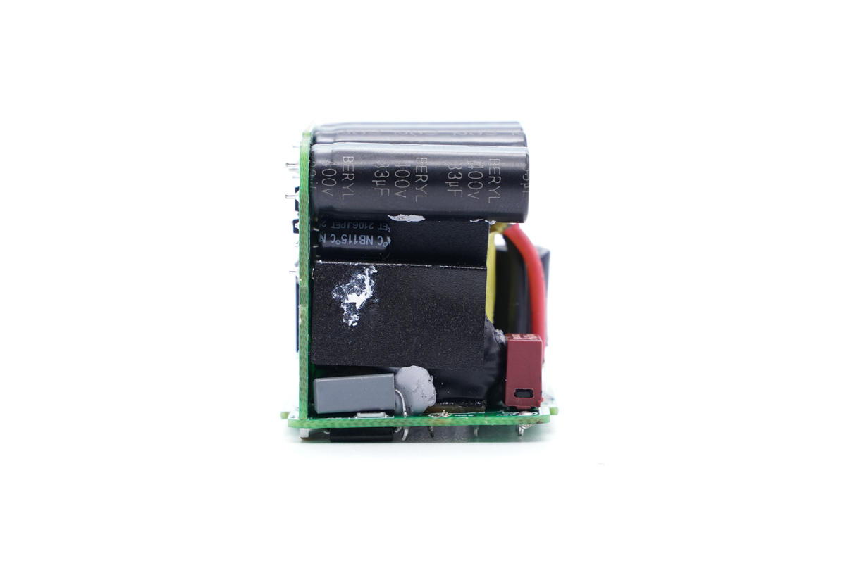 主板正面一览,贴片Y电容横跨初次级,次级侧设有两颗固态电容以及输出VBUS开关管。