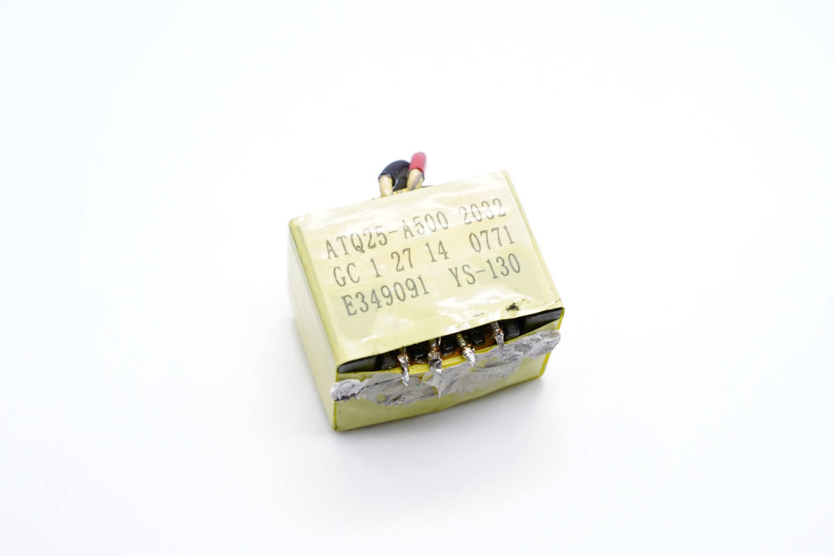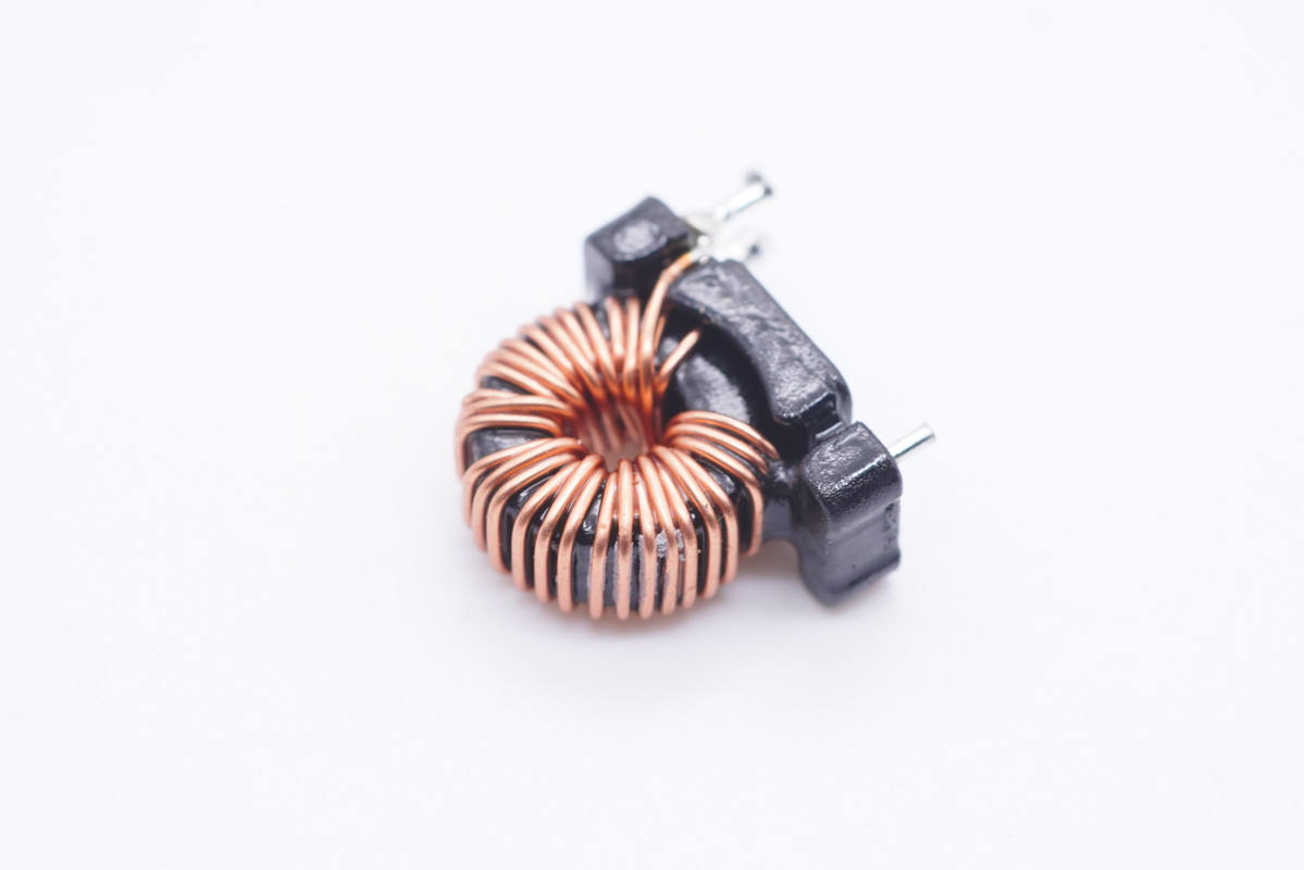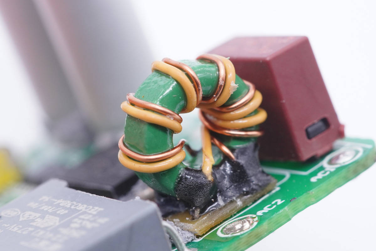 共模电感双线绕制,底部有玻纤板绝缘,并打胶固定,用于滤除EMI干扰。