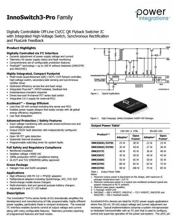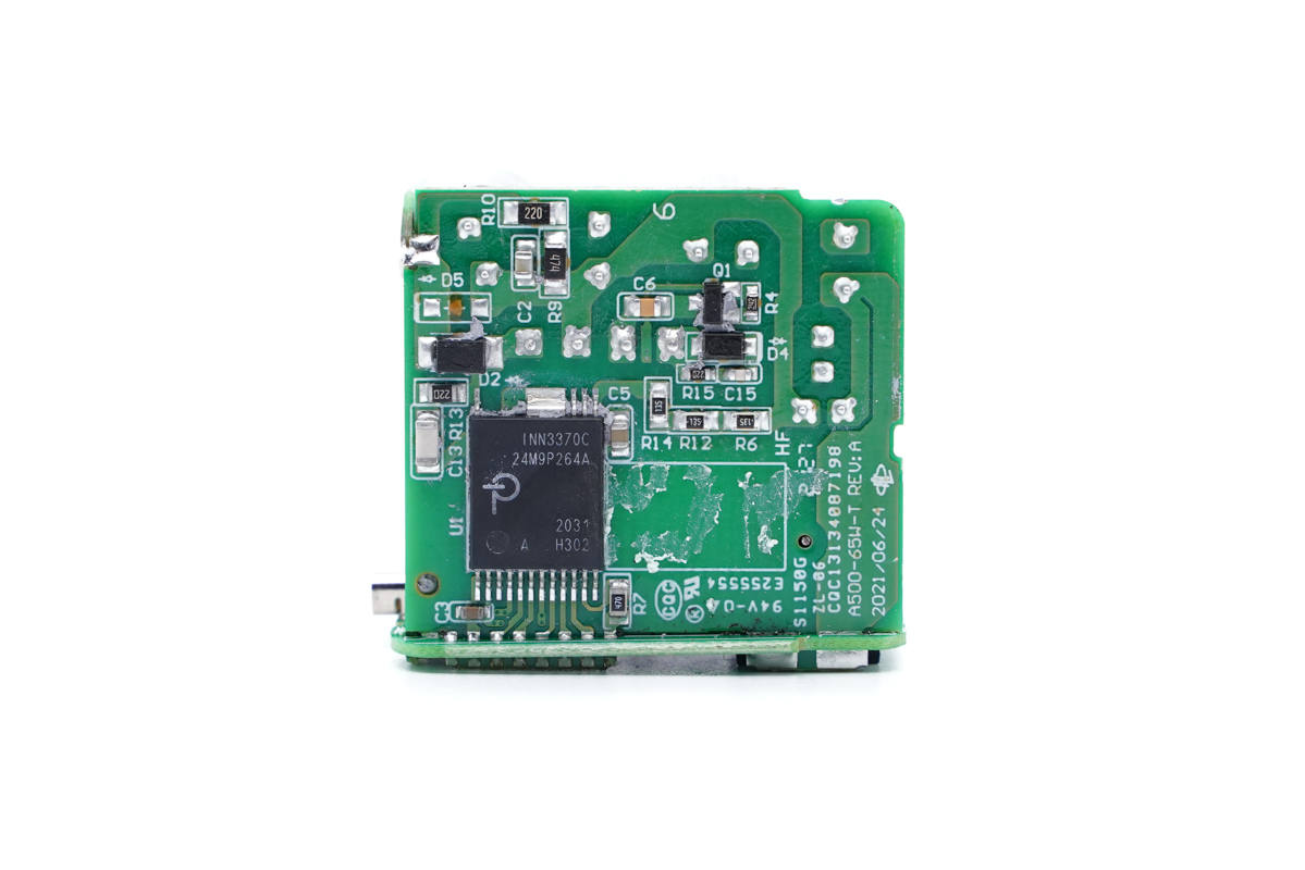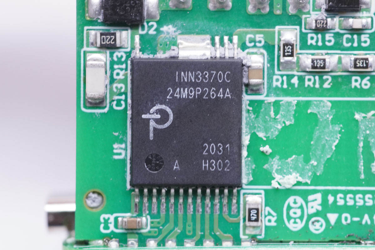 充电器主控芯片采用PI INN3370C,这是一颗集成了高压开关、同步整流和FluxLink反馈功能的数控恒压/恒流离线反激式准谐振开关IC,INN3370C使用PowiGaN技术,内置750V耐压GaN开关管,最大支持100W输出,在i2c数传动态高精度控制的同时,INN3370C还内置一路3.6V输出为外置协议IC供电。