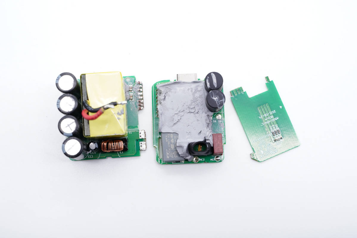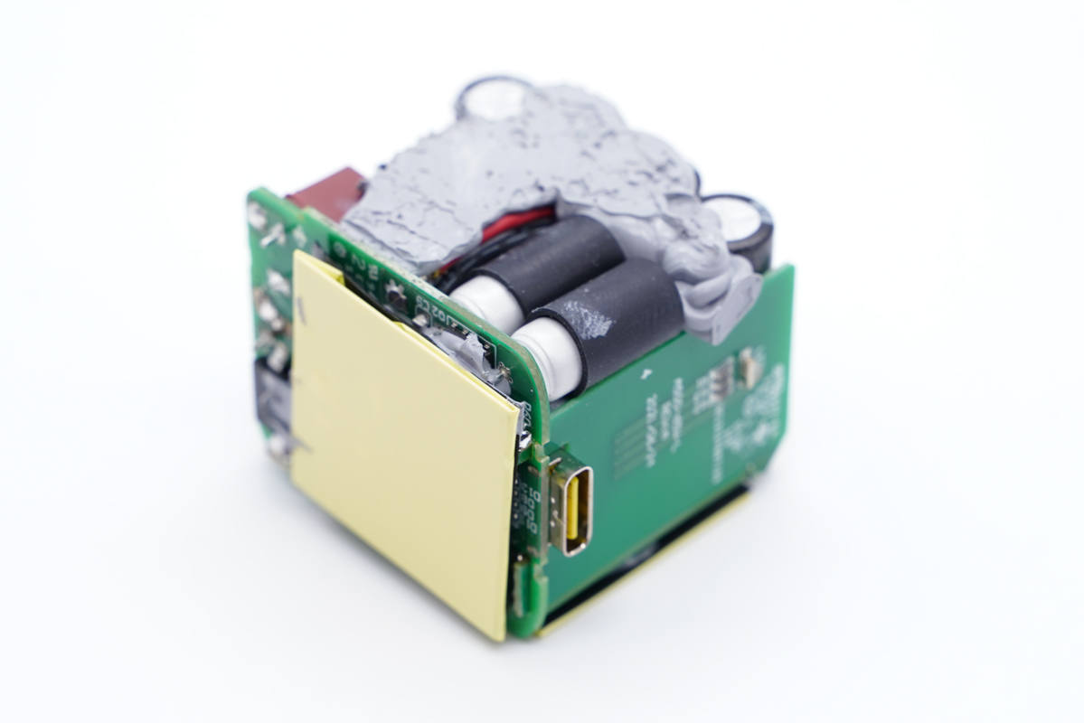 散热板贴合面还有隔离板,小板上贴有导热垫并打胶,充电器设计上格外注重绝缘散热。