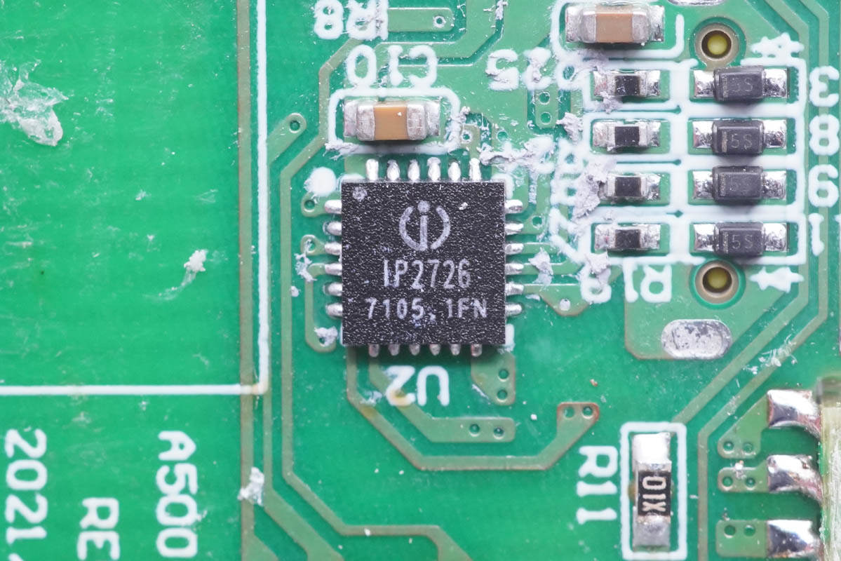 协议芯片采用英集芯IP2726,这是一颗集成多种协议、用于USB输出端口的快充IC,支持Type-C DFP、PD2.0/3.0、PPS、QC4+、QC2.0/3.0、FCP、AFC、SCP、MTK PE+、Apple2.4A、BC1.2以及三星2A等协议。具有高集成度和丰富的功能,在应用时仅需极少的外围器件,有效减小整体方案的尺寸,降低BOM成本。