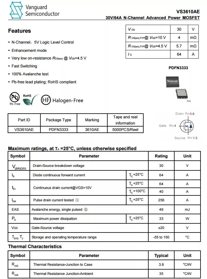 输出VBUS开关管采用威兆半导体VS3610AE,NMOS,耐压30V,PDFN3333封装。