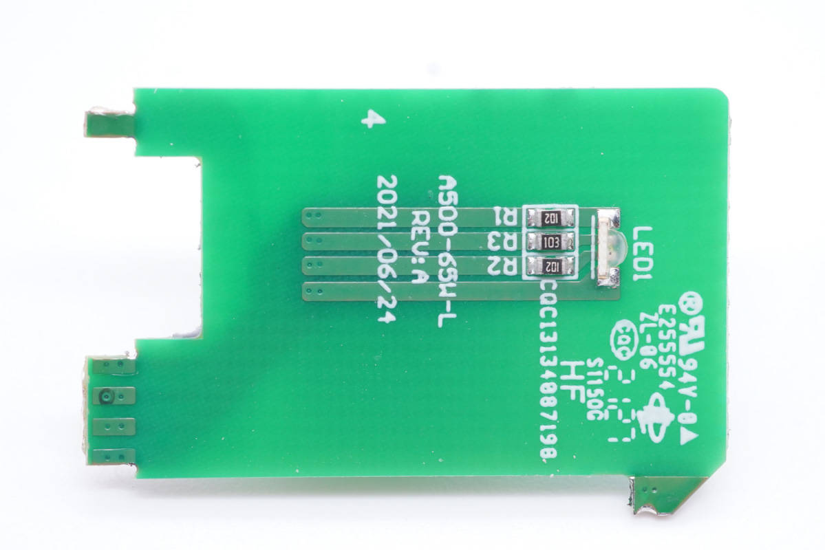 输出端小板正面设有指示灯,由英集芯协议芯片控制发色,指示输出状态。另外也是为了加固PCBA模块。