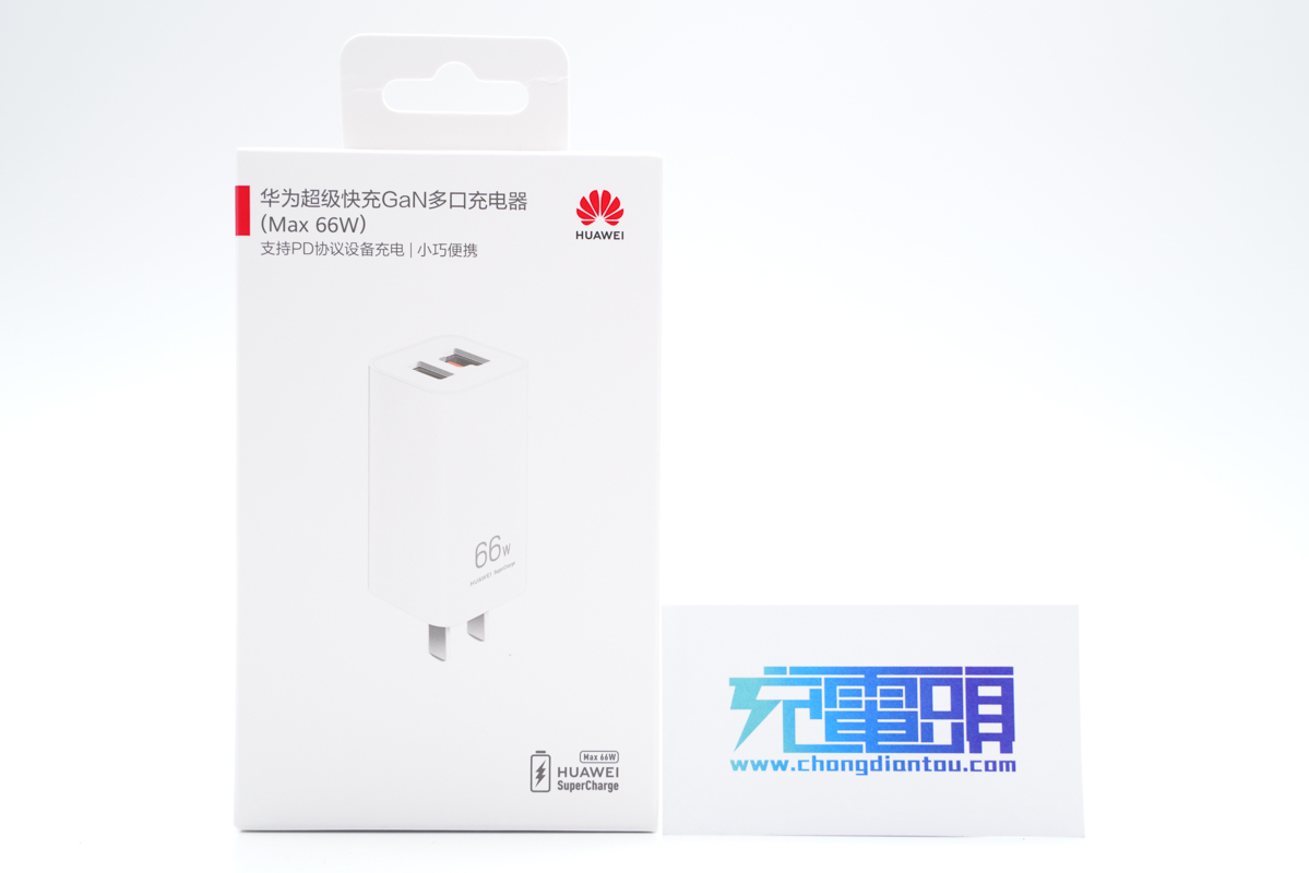 包装盒也是华为快充产品一贯的包装风格,正面展示出了产品的三维外观图。