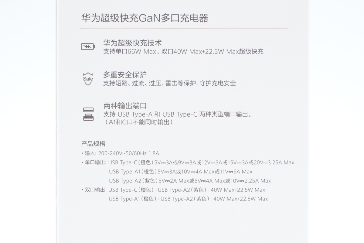 背面介绍出了产品支持华为超级快充技术、具备多种安全保护以及两种输出接口,下面是详细的参数信息,这个后面再看。