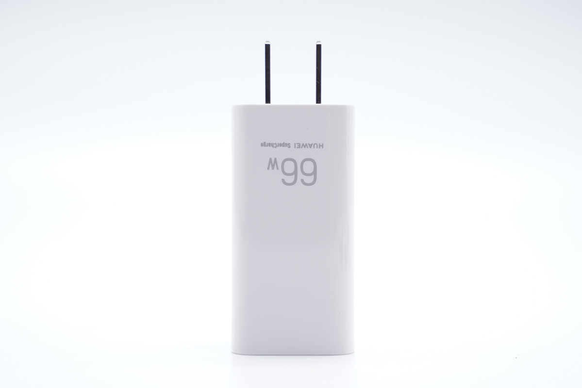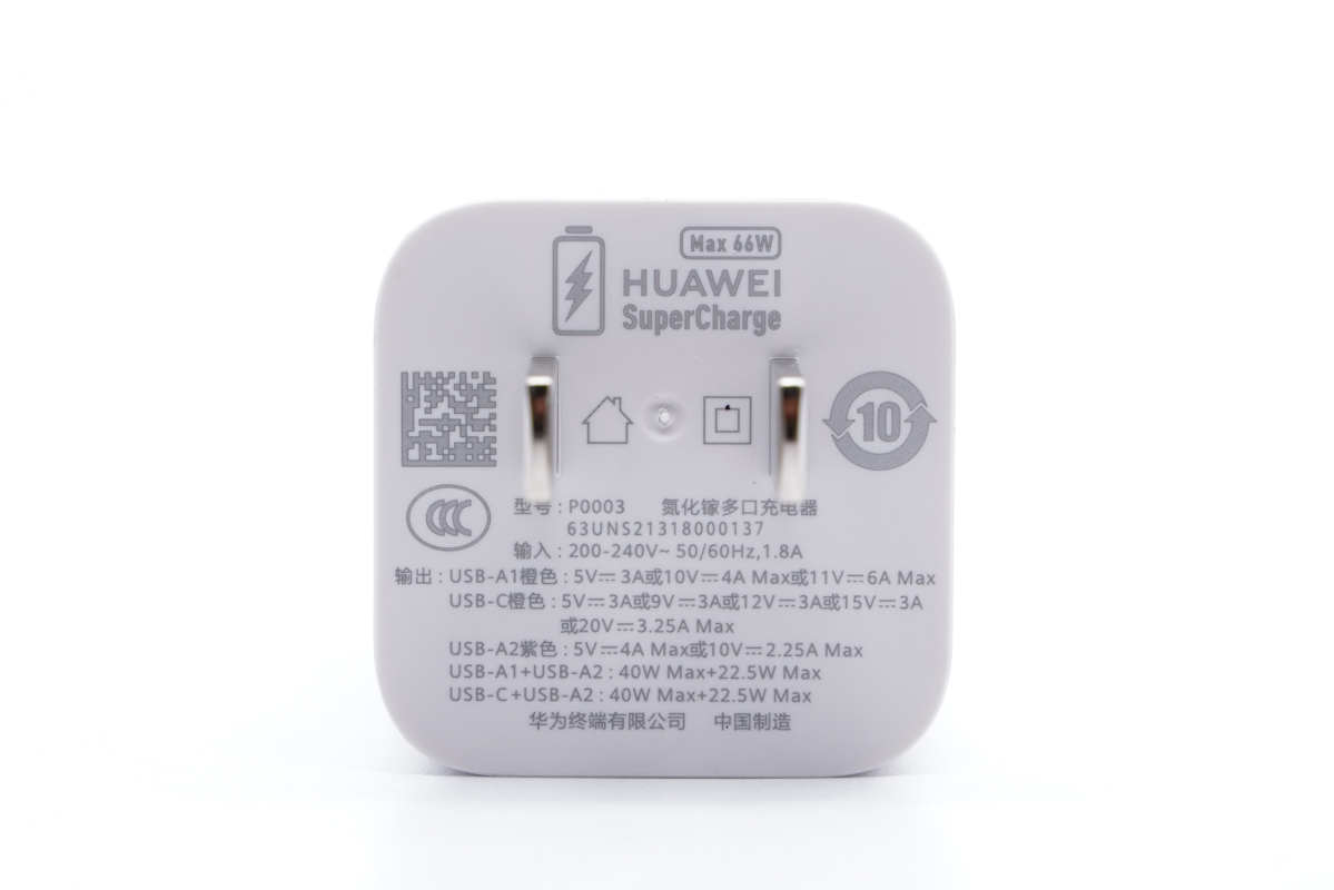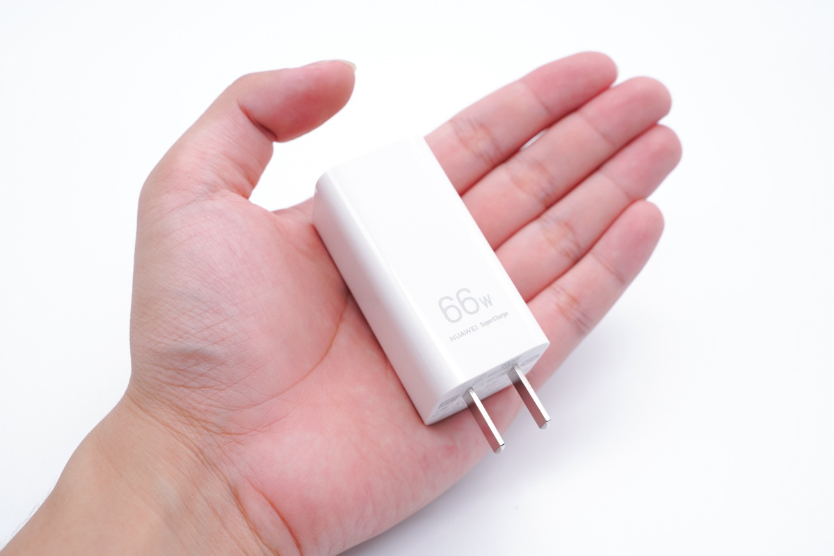 拿在手上还是十分小巧的,毕竟这是支持华为66W快充的氮化镓充电器,壳体上面的66W标识也证明了这一点。