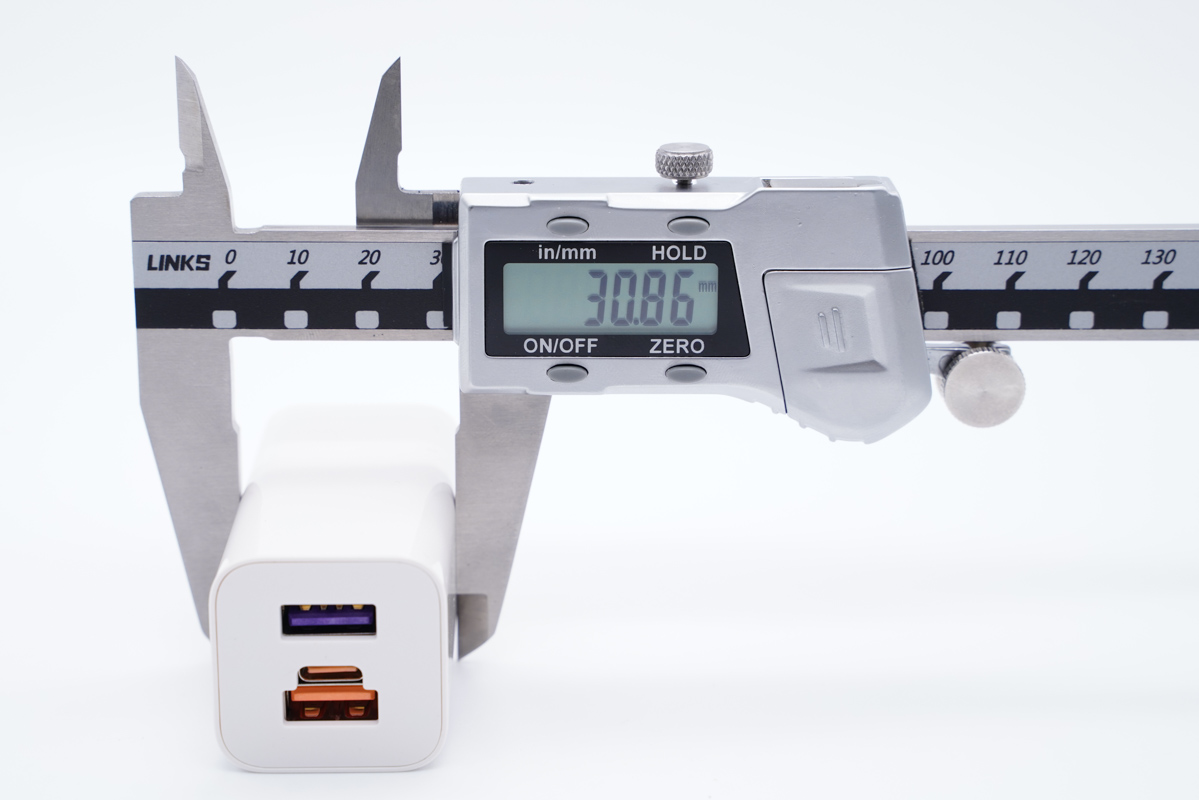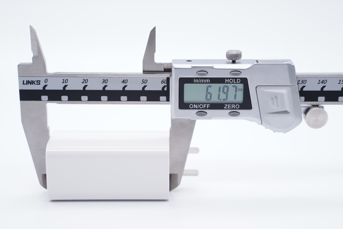 体积方面,使用卡尺实测华为超级快充GaN多口充电器的长度约为61.97mm(不含插脚)。