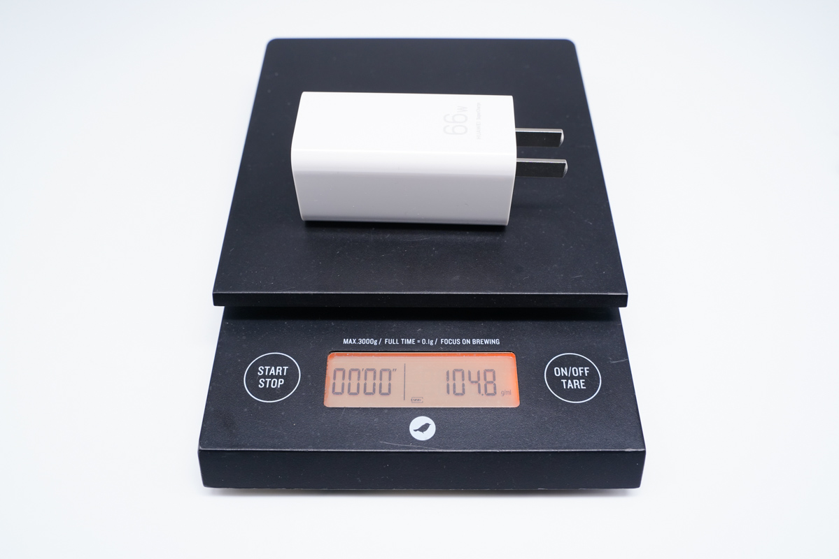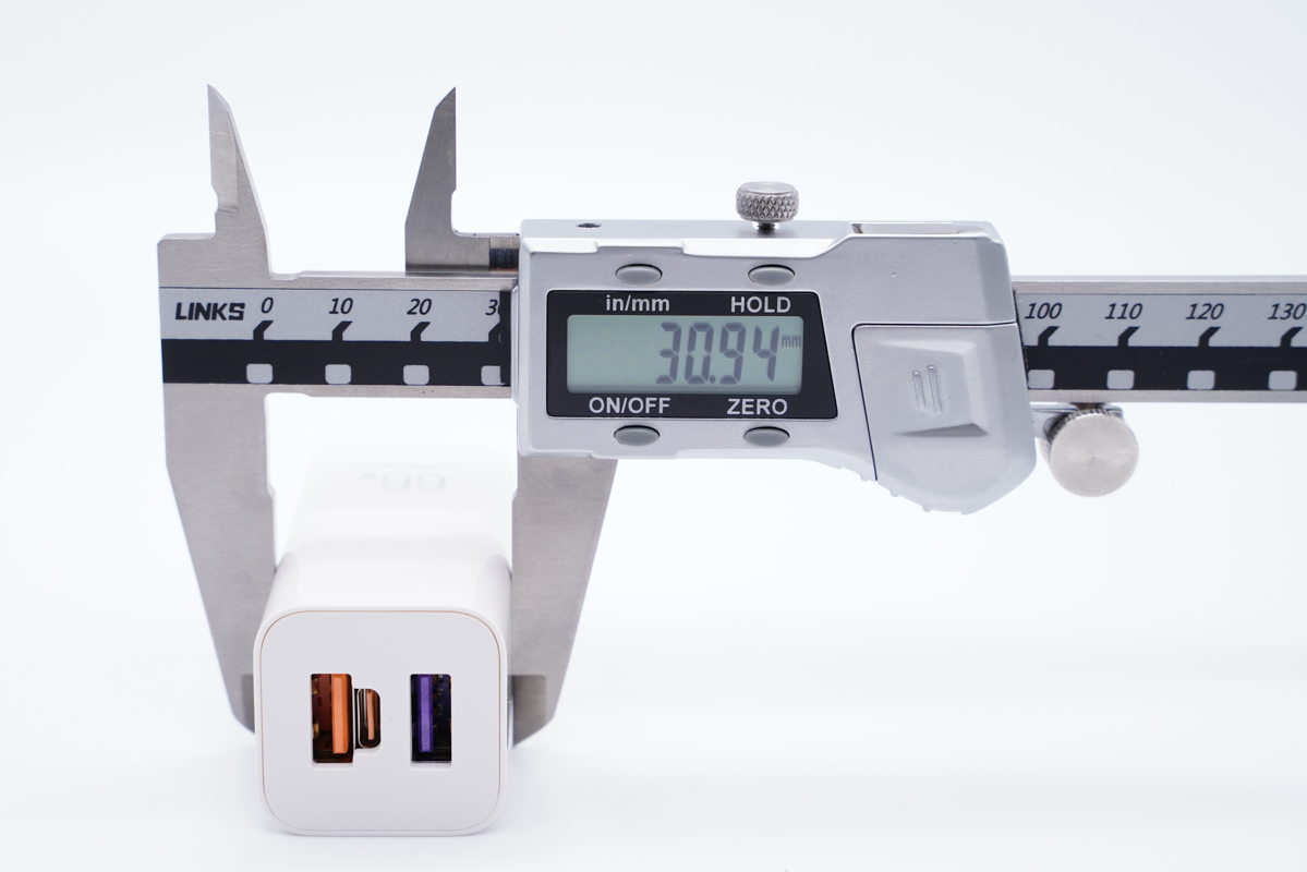 可以得出充电器的三维参数约为61.97x30.86x30.94mm,充电器的体积约为59.16cm³,以最高输出66W计算,功率密度约为1.11W/cm³。