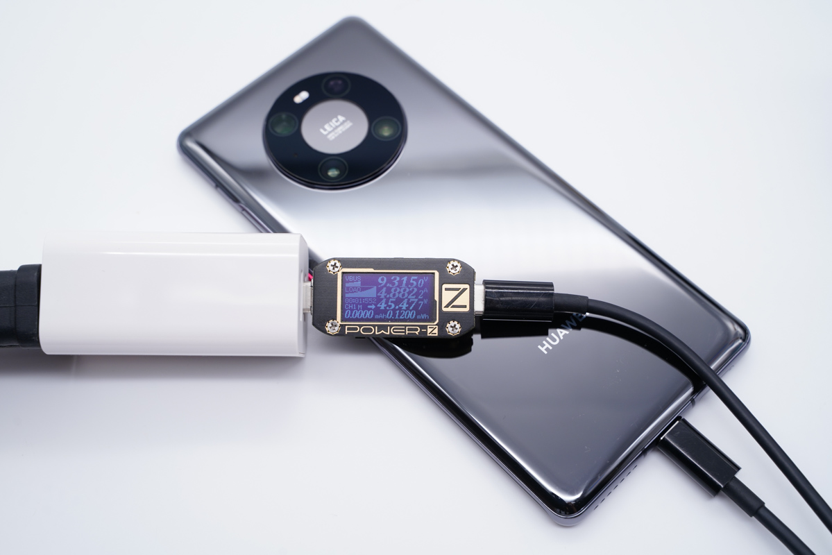 USB-C支持PD快充,使用USB-C为华为Mate40 Pro充电,功率为9.31V 4.88A 45.47W,USB-C同样支持华为私有大功率快充。