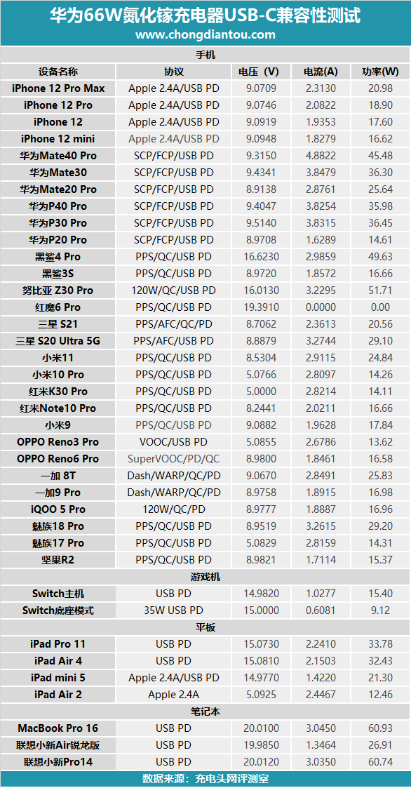 USB-C的测试数据汇总,为大部分设备充电均可以实现快充,特别针对一些机型可以提供50W大功率快充,而且还支持65W PD快充,只是针对红魔6 Pro的快充兼容性一般。