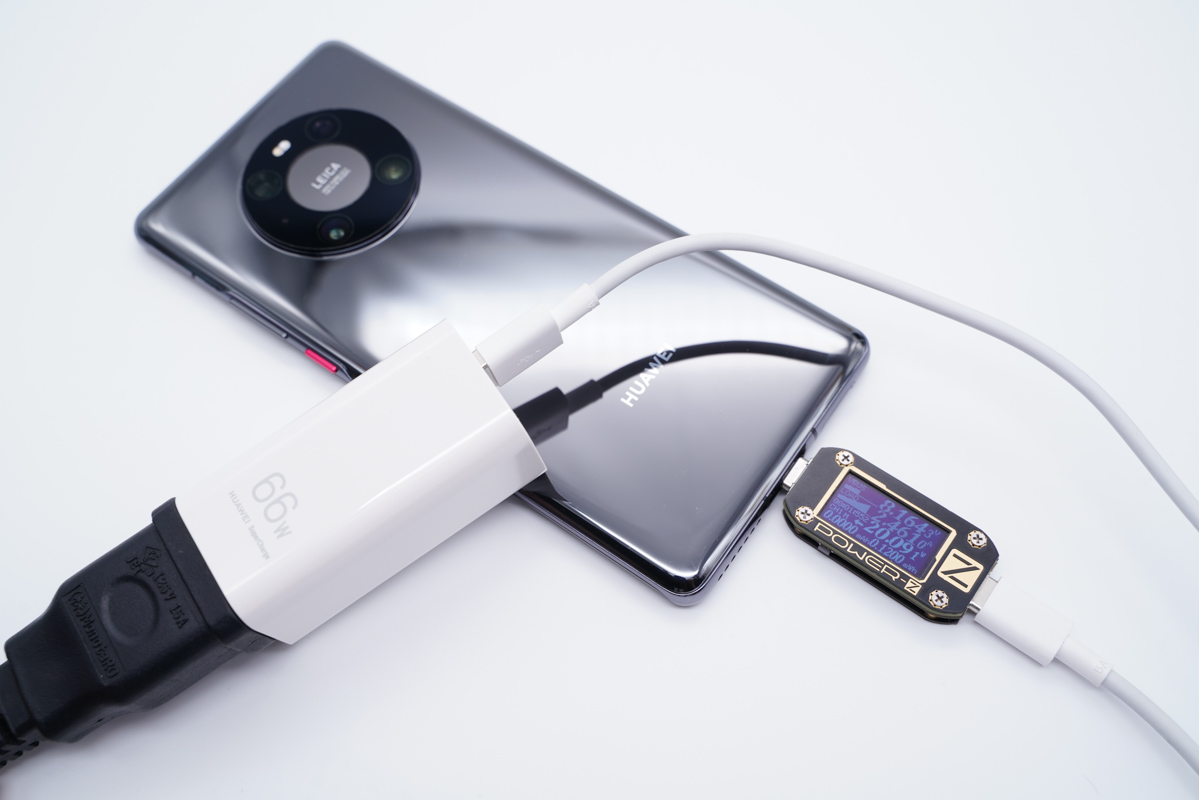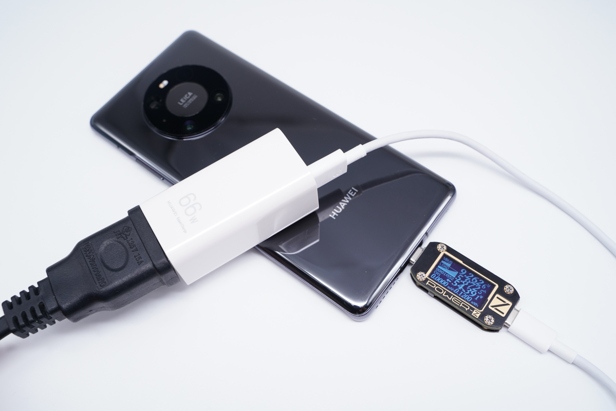 橙色内舌的USB-A接口支持66W快充,为华为Mate40 Pro充电功率为9.26V 5.87A 54.37W。