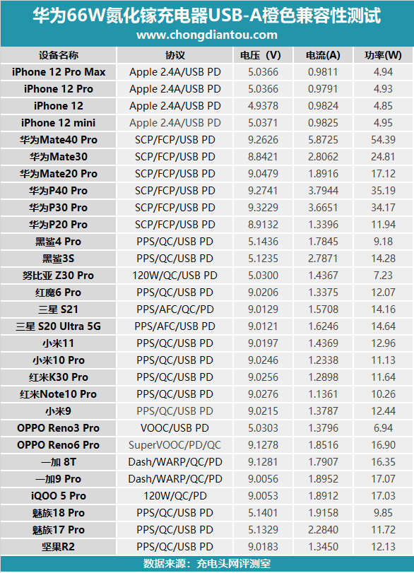 橙色内舌的USB-A接口的测试数据汇总,为部分华为机型可以提供高压SCP快充,对其他大部分安卓设备可以提供QC快充服务。