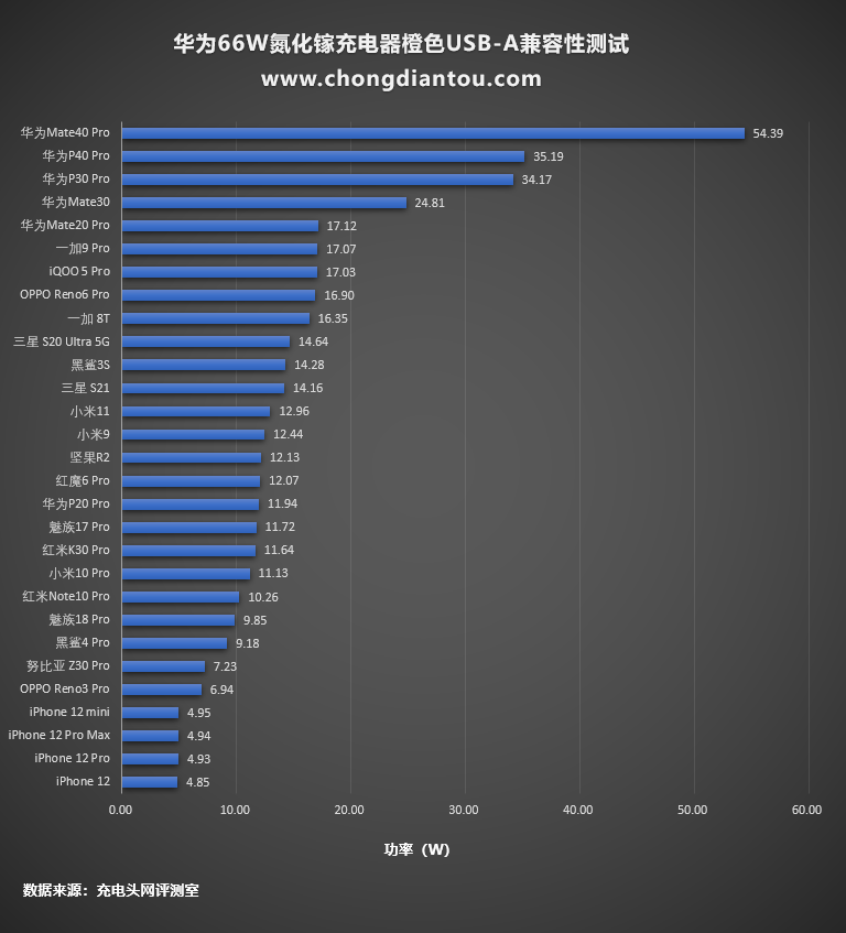 橙色内舌的USB-A支持66W快充,为华为Mate40 Pro充电功率达到了54.39W,为柱状图中功率最高的位置,其他华为机型也可以触发快充,剩余其他安卓机型的功率处于正常状态。