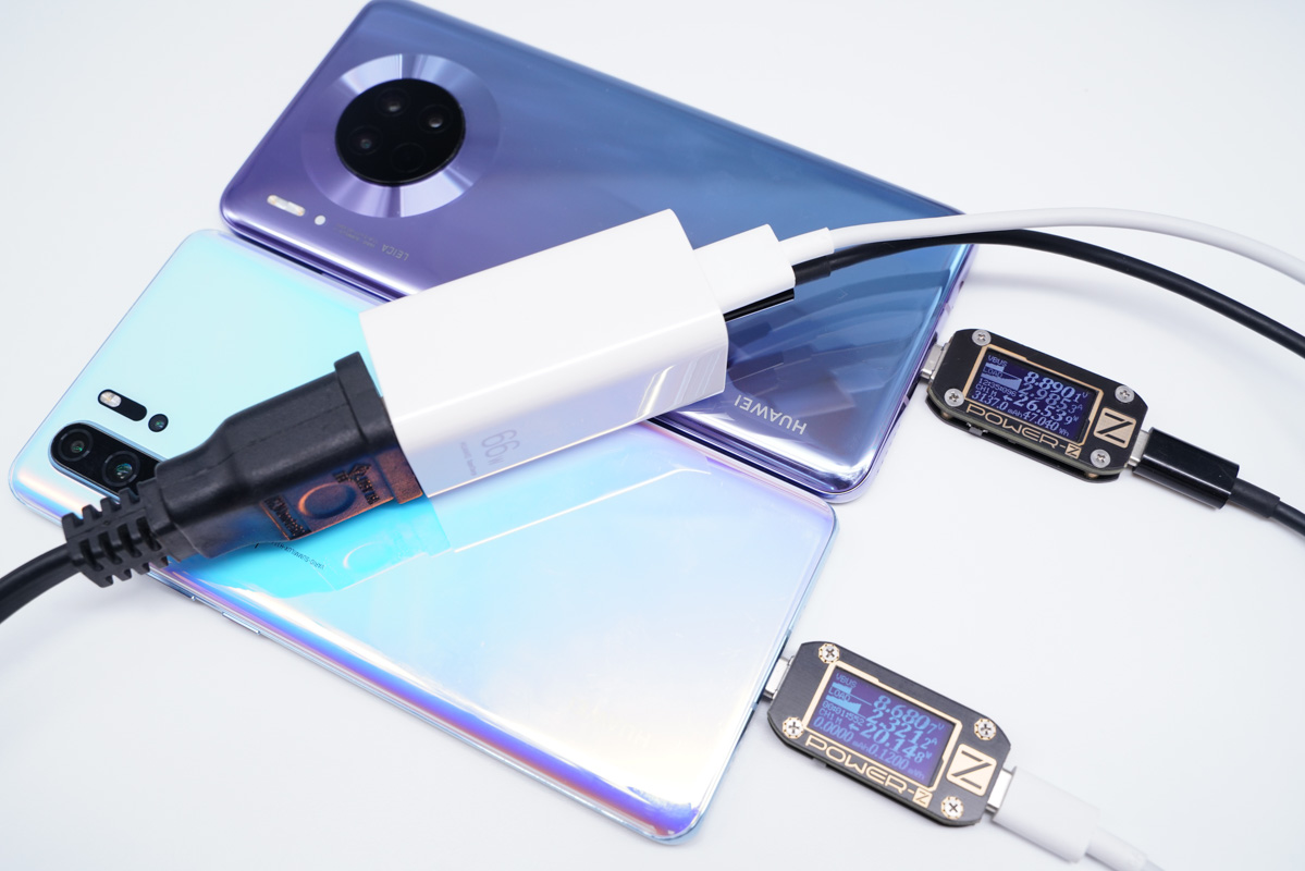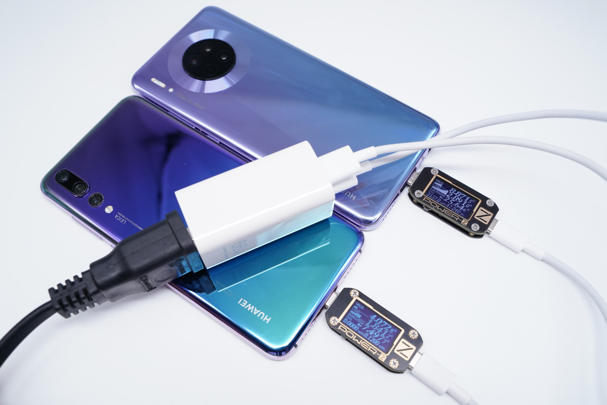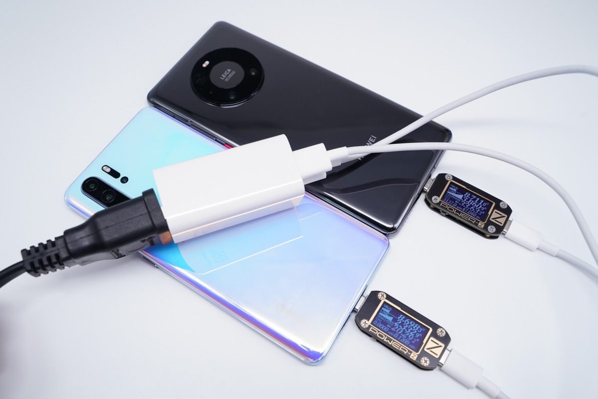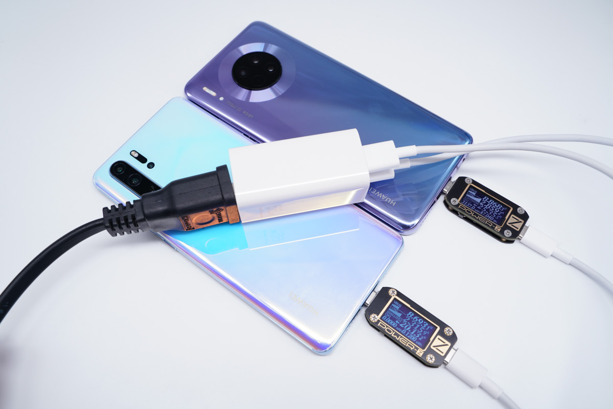 使用USB-C为华为Mate30充电,功率为26.53W;同时使用USB-A紫色为华为P30 Pro充电,功率为20.14W,双口均处于快充状态。