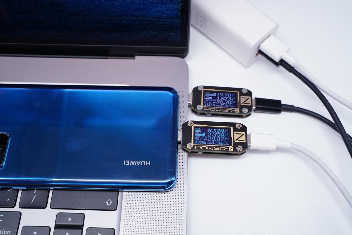 使用USB-A橙色为华为Mate20 Pro充电,功率为26.50W;同时使用USB-A紫色为华为P20 Pro充电,功率为7.52W,同样华为P20 Pro无法触发快充。