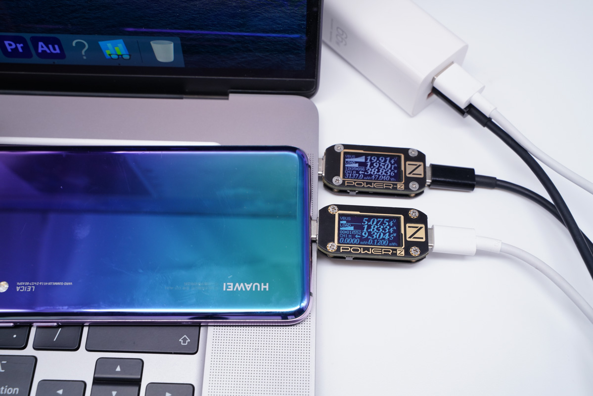 使用USB-A橙色为华为Mate30充电,功率为25.64W;同时使用USB-A紫色为华为P20 Pro充电,功率为7.49W,同样华为P20 Pro无法触发快充。