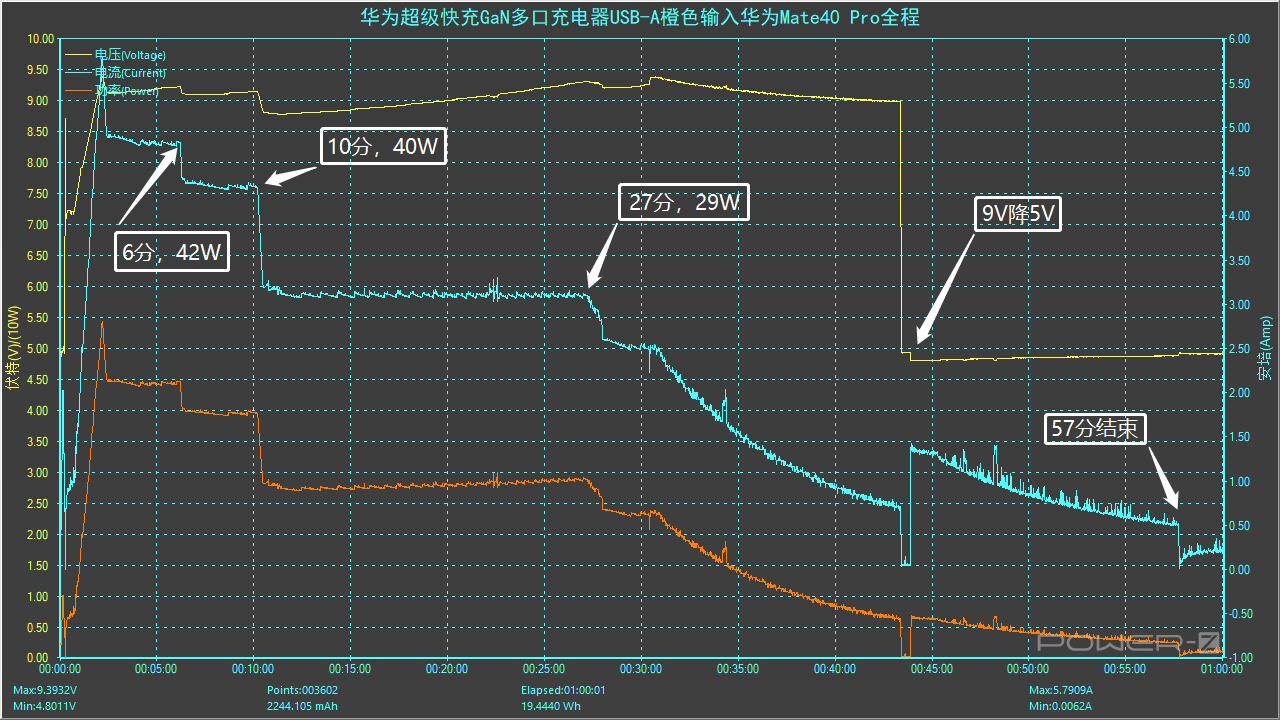 这里采集了使用充电器的橙色USB-A接口为华为Mate40 Pro的充电全程,线材为华为6A A to C快充线,以上是整个测试过程,全程耗时约57分,最高功率为9.38V 5.79A 54.37W。