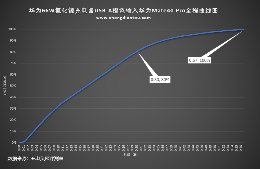 将充电全程绘制成曲线图,橙色的USB-A接口为华为Mate40 Pro半小时充电80%,完全充满需要57分。