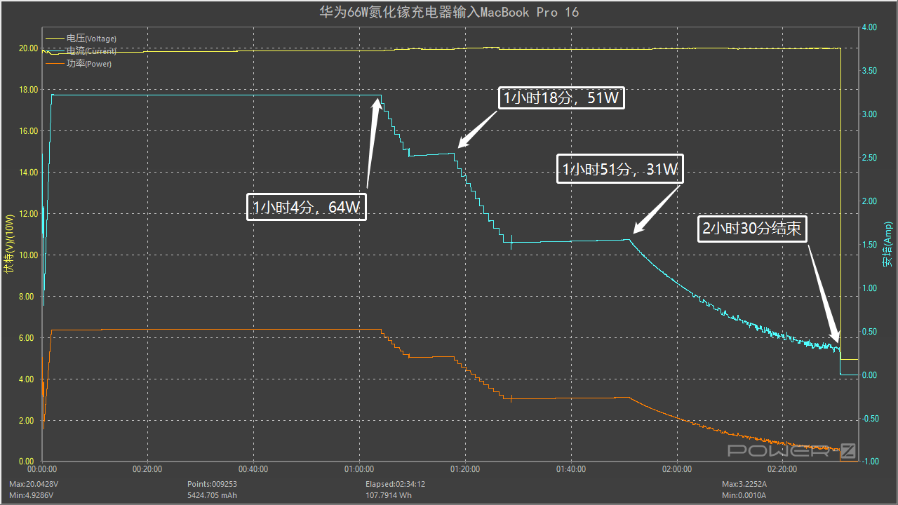 这是使用充电器的USB-C为MacBook Pro 16充电全程的数据,全程耗时约2小时30分。