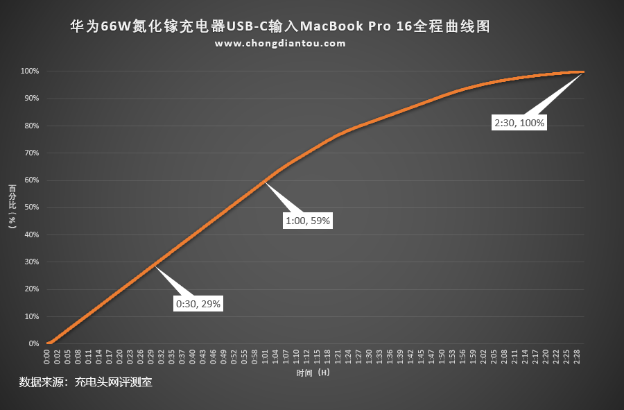将充电全程绘制成曲线图,USB-C为MacBook Pro 16半小时充电29%,1小时充电59%,完全充满需要2小时30分。