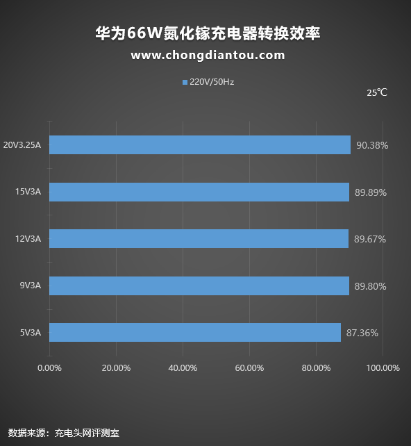 我们平时看充电器上面的参数输出100W或者65W是充电器可以为设备提供的最大输出功率,但充电器从插座上汲取的功率往往要更大一些,下面是华为66W氮化镓充电器在220V 50Hz交流输入的情况下进行了转换效率测试,测试结果如下: