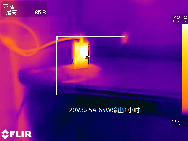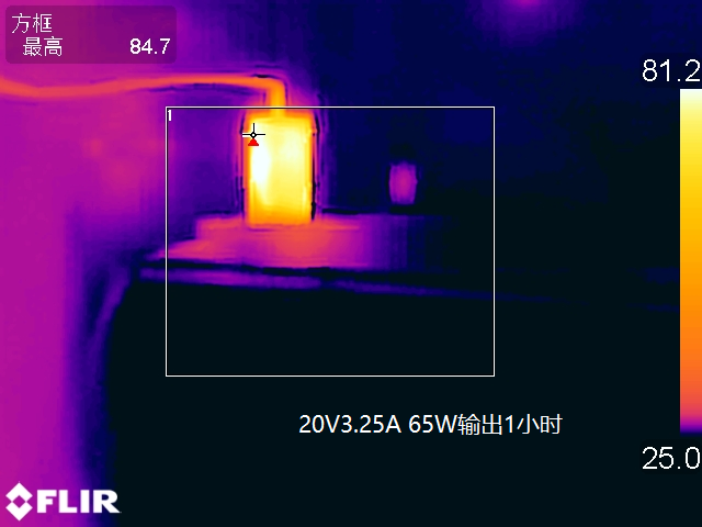 让充电器以20V3.25A 65W的功率持续满载输出1小时后采集到充电器表面的最高温度为84.7℃。