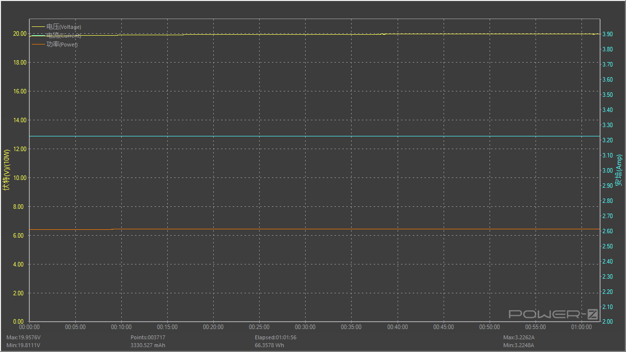 在测试温度时同时也测试了充电器是否可以稳定输出,按照额定功率20V 3.25A 65W满载对充电器进行稳定性测试,测试时间为一小时,测试过程中电压值呈水平直线,无明显波动情况,长时间满载比较稳定。