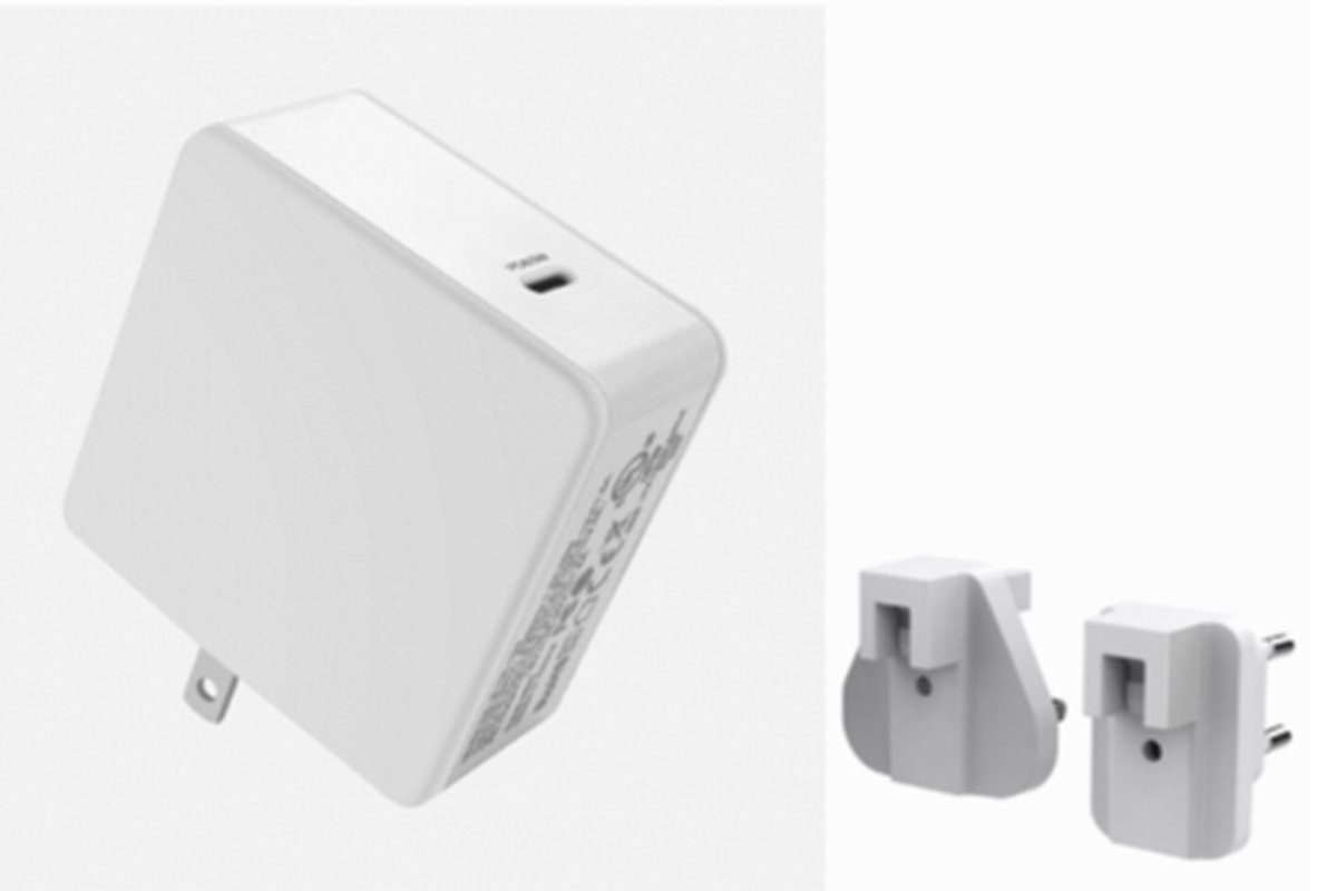 100W 单C口可换头氮化镓充电器按照高功率密度设计,单口USB-C输出口,标配两脚美规插脚,并采用可替换插脚设计,更换成欧规、英规等插脚使用。内置PFC线路,可以对全球销售,生产工艺简单,性价比高。
