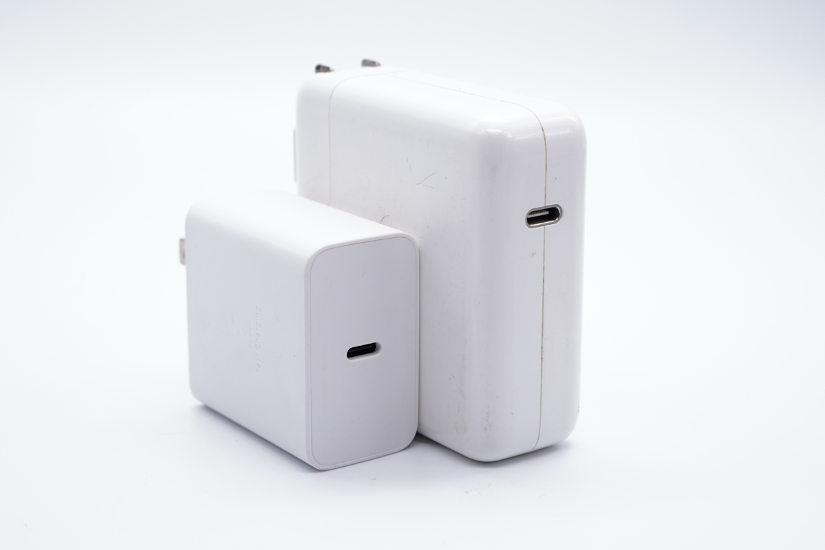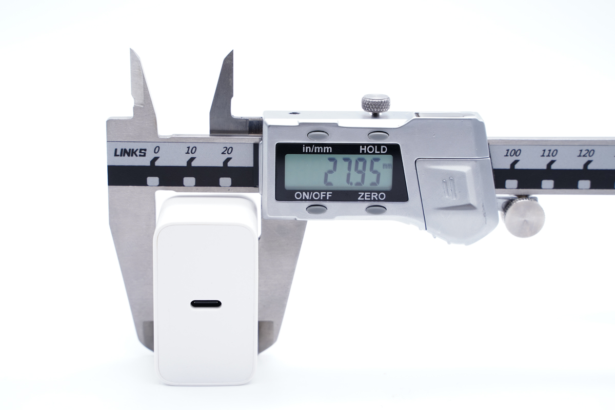 通过对比发现,整个充电器的体积仅苹果61W一半大小。