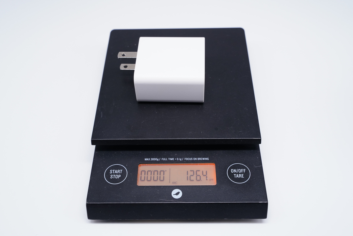 充电器体积虽然小巧,但拿在手上还是有一点分量的。