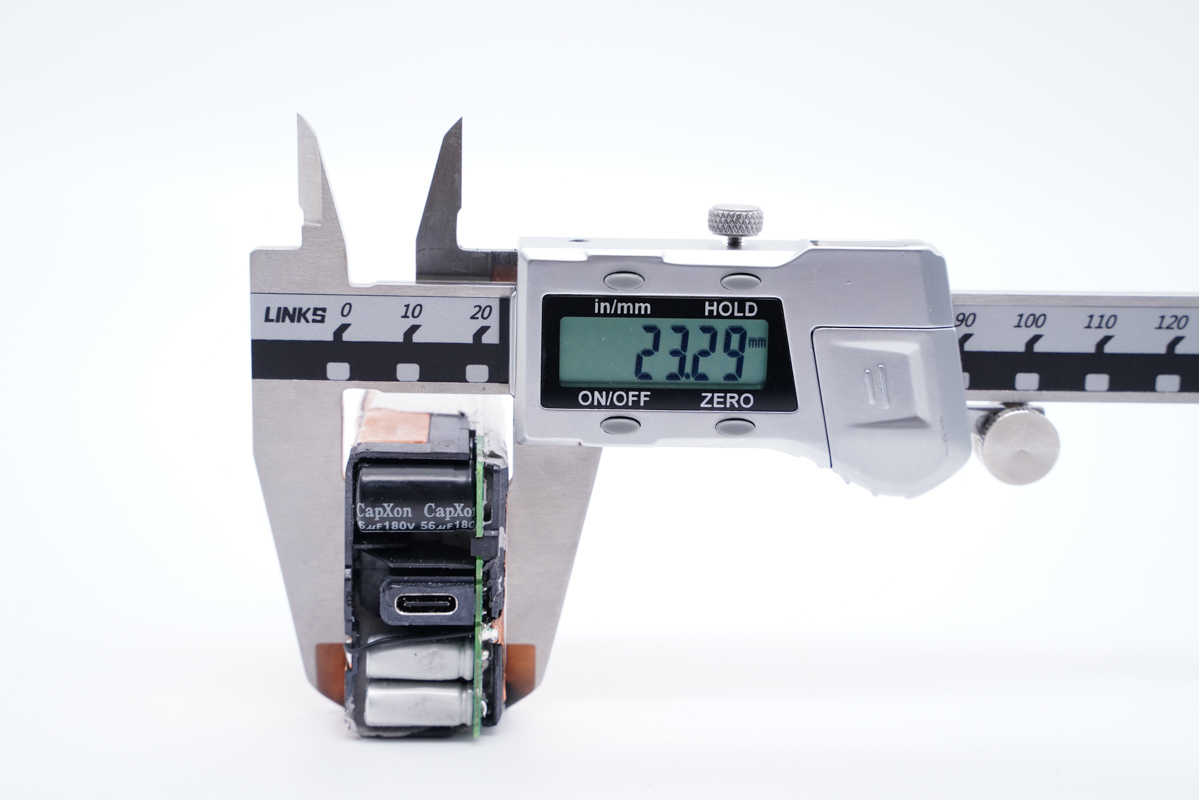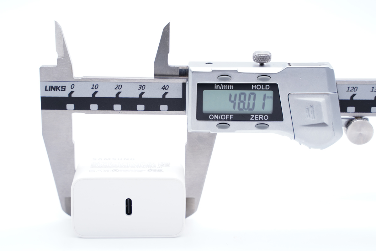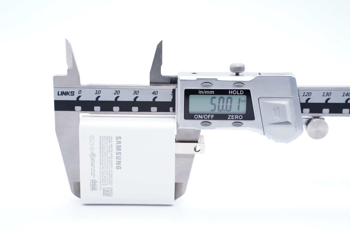 厚度约为28mm。通过计算,这款充电器的功率密度达到了0.97W/cm³,这也成为了三星历代充电器中,功率密度最高的一款;同时在目前市面上主流的65W快充配件中,也是相对较高的。