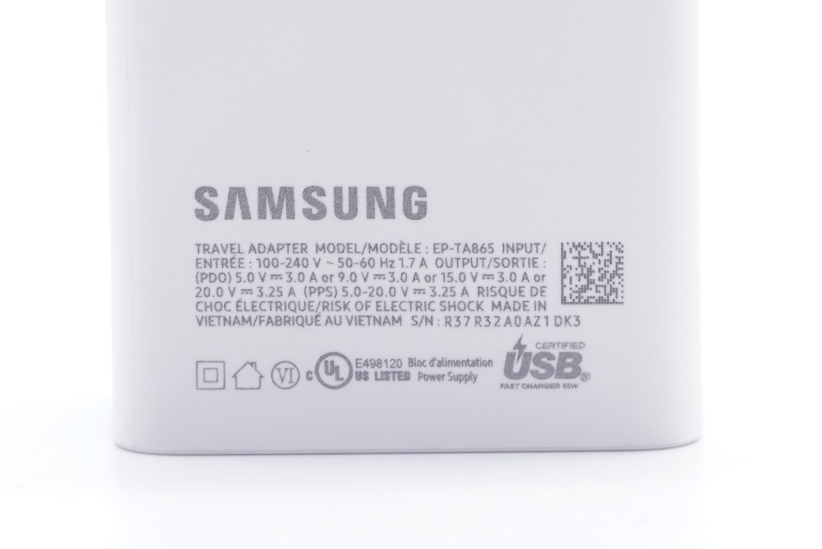 充电器型号为EP-TA865,支持100-240V 50/60Hz宽电压输入,额定电流1.7A;输出支持5V3A、9V3A、15V3A、20V3.25A以及3.3-21V3.25A。充电器由越南工厂代工生产,并印有VI级能效,UL等认证标志。