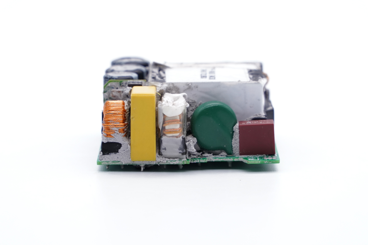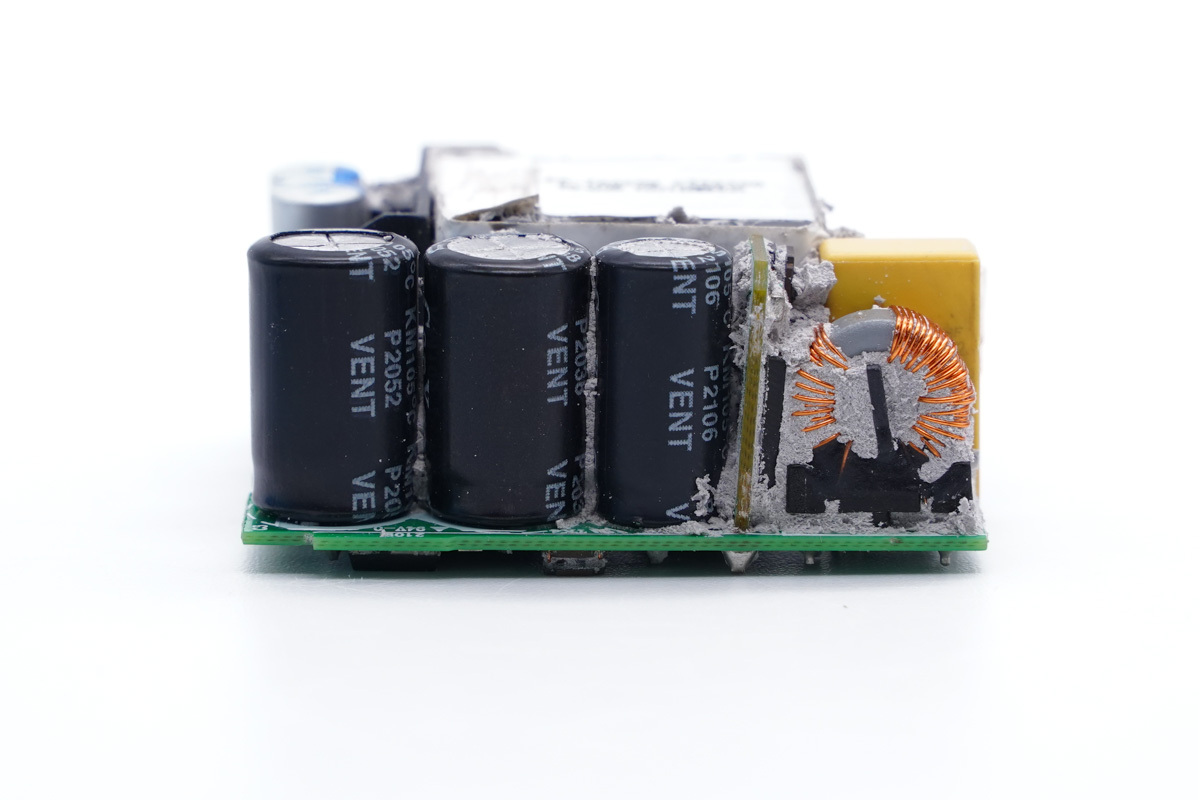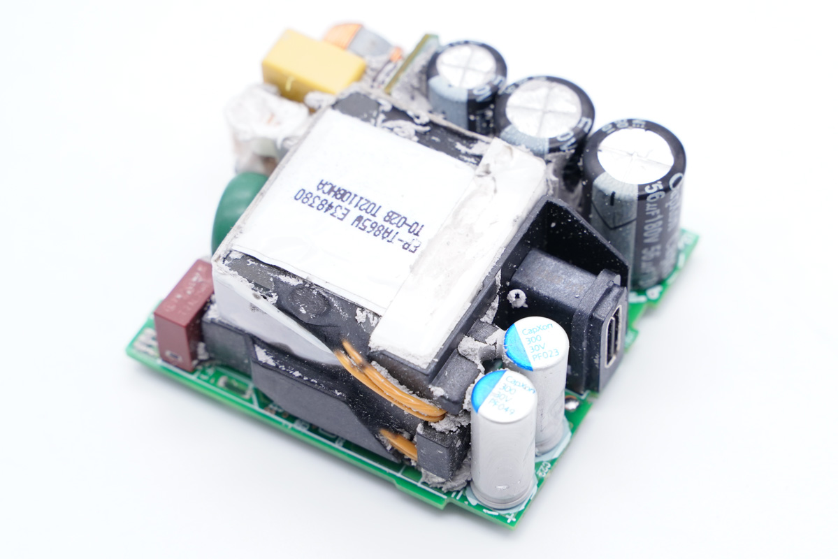 滤波后的高压直流电由变压器降压,并再次整流滤波,最后由协议芯片控制接口输出。可以看到,整个变压器占据了内部一半以上的空间,初次级之间设有塑料挡板隔离绝缘。
