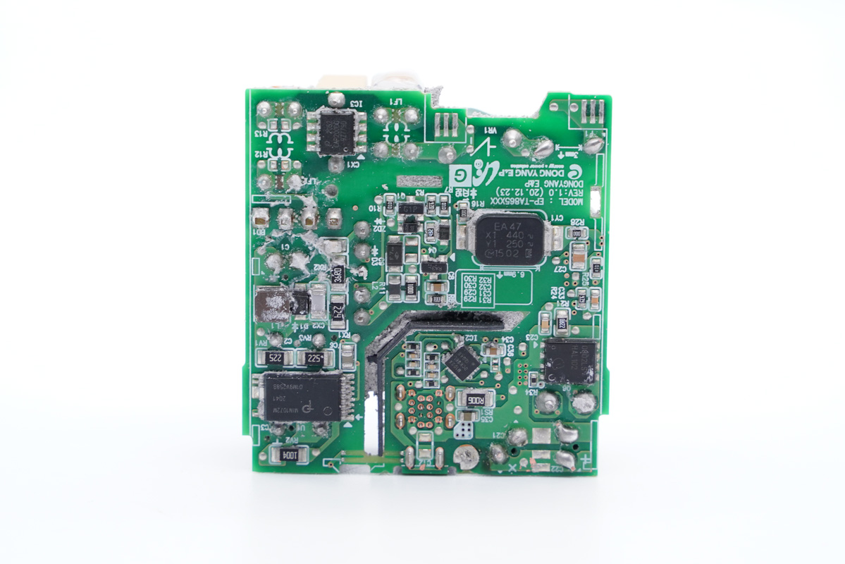 PCB板背面主要是贴片元器件,初级和次级之间采用镂空处理并加装隔离板。通过充电头网的观察分析发现,这款充电器采用的是开关电源+协议芯片的宽范围输出架构。