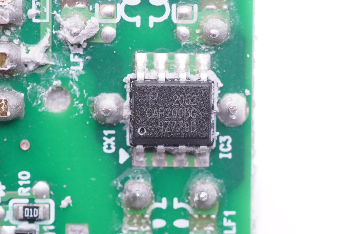 背面输入端设有一颗PI的X电容放电芯片,型号CAP200DG,这颗芯片在充电器断开交流电后,可以通过放电电阻为X电容放电,避免X电容放电电阻的功率消耗。可靠性高、使用方便,并可有效提高充电器能效。