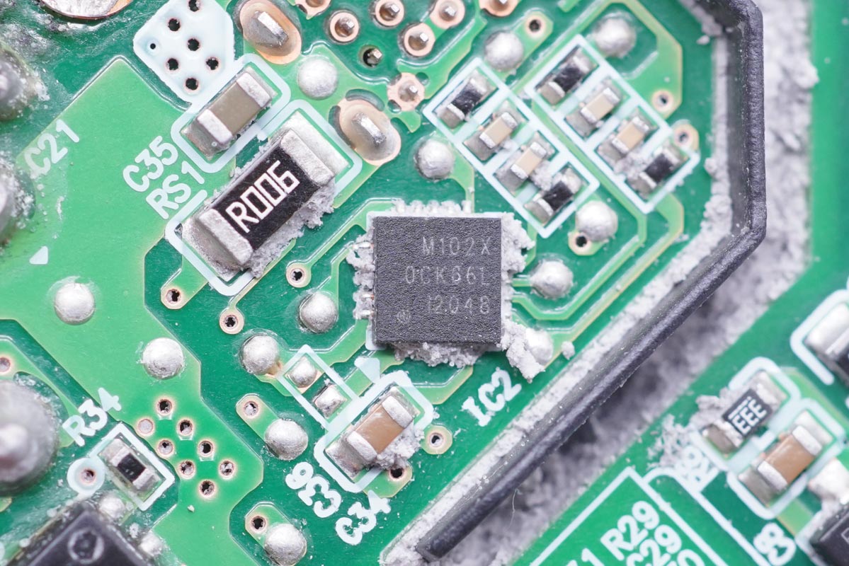 背面接口旁边这里设有一颗协议芯片,这是三星自研的快充芯片,丝印M102X。此前拆解的三星45W充电器中都用的是MM101系列,这颗应该就是MM101系列的升级版。