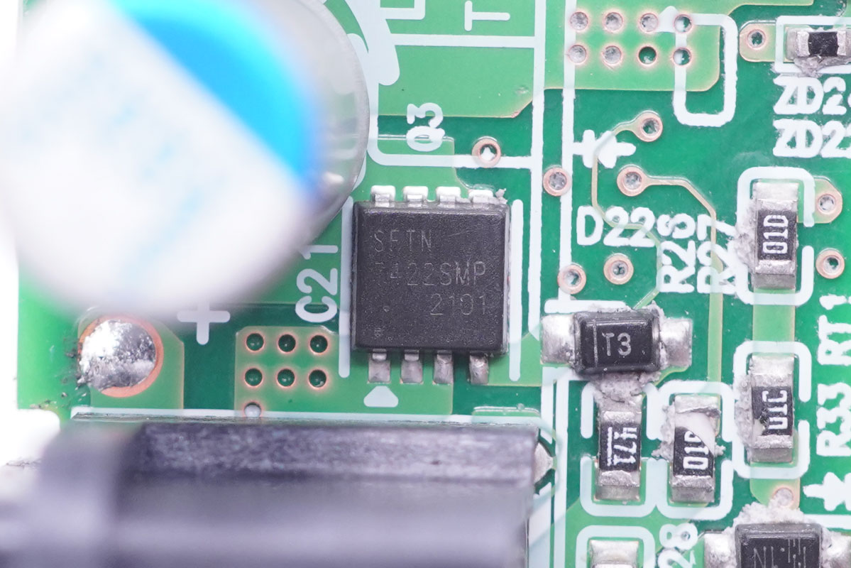 充电器的电源主控芯片同样是来自PI,不过采用的是定制型号SC1922C,芯片内置开关管和初级PWM控制器,同步整流控制器,以及反馈控制等功能。