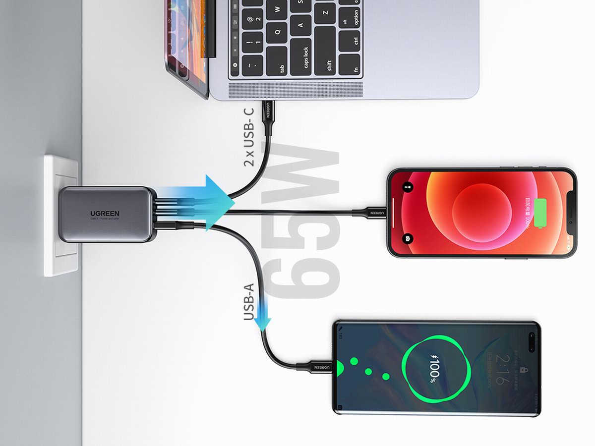 绿联小口红基于USB PD快速充电标准开发,并带有多种市面上常见的快充协议,60分钟即可为Macbook Pro 13充入75%电量、30分钟为iPhone12充入50%电量、30分钟为华为P40充入64%电量,适用于市面上绝大部分主流数码设备使用。最大支持三设备同时充电,通过智能识别功能适配当前输出策略,可以在65W、45W+20W、45W+8.5W+8.5W等不同状态下运行,多设备同时充电场合也可以放心使用。