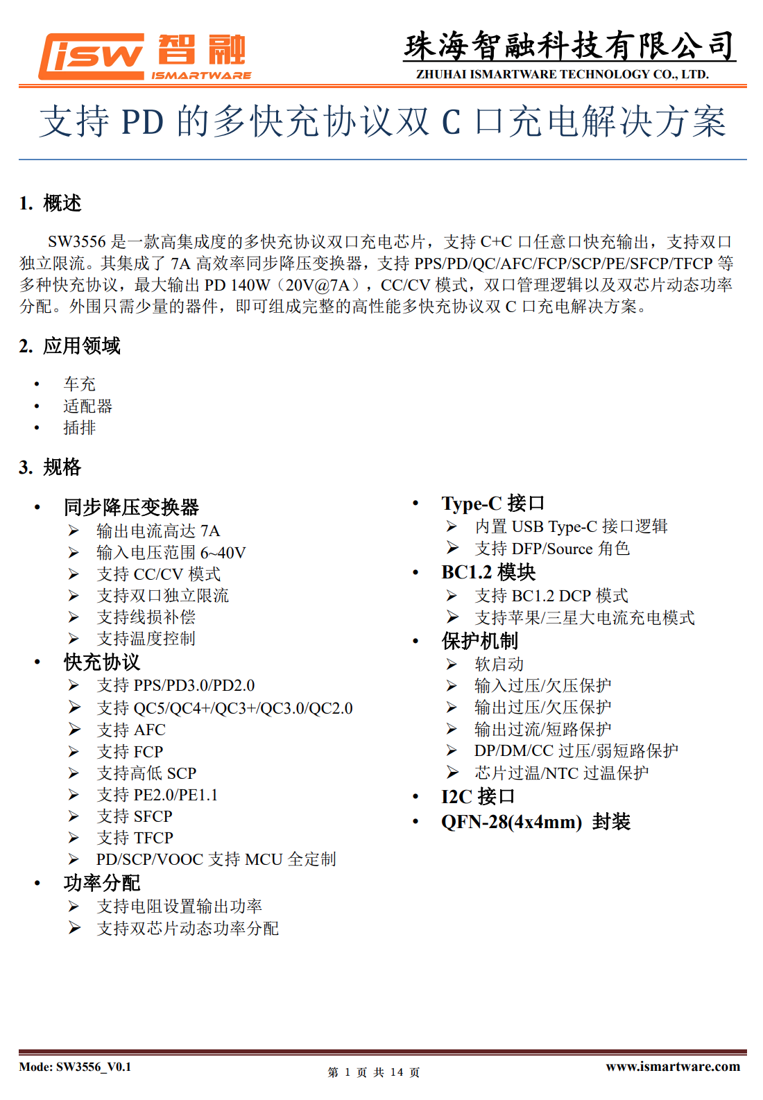 智融SW3556是支持双USB-C口的内置多快充协议的降压控制器芯片,支持双口功率盲插,支持双口独立限流。内置的同步降压转换器支持7A大电流输出,并且支持氮化镓开关管,可获得更小的体积和更高的效率。支持非常广泛的快充协议,并支持定制私有快充协议,最大支持20V7A 140W输出,支持3.3-21V 6A PPS快充输出,充分满足现代手机及大功率设备充电需求。