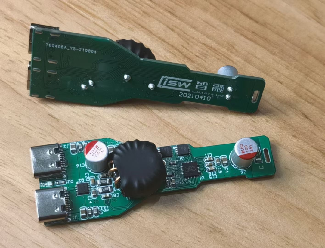 图为智融SW3556参考设计,采用降压架构,电路板上只有两颗降压开关管和两颗VBUS通路管,以及智融SW3556,外围元件很少,电路非常精简。