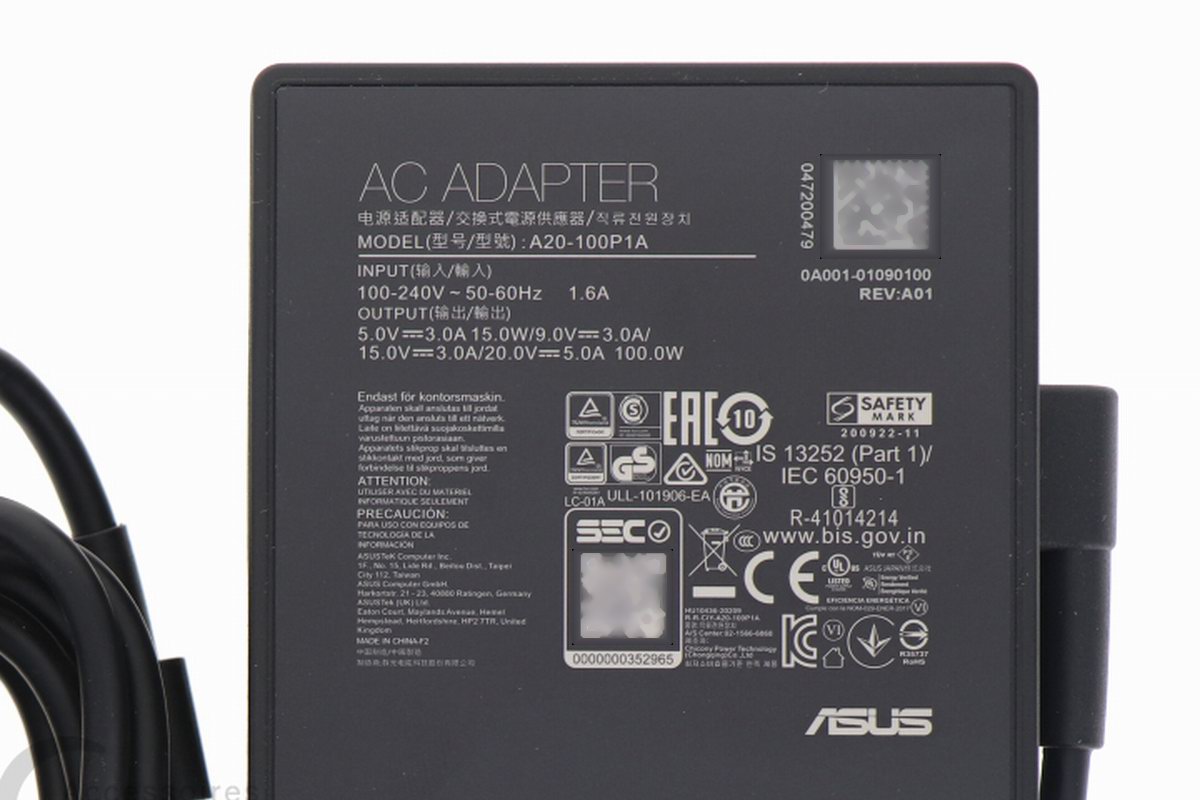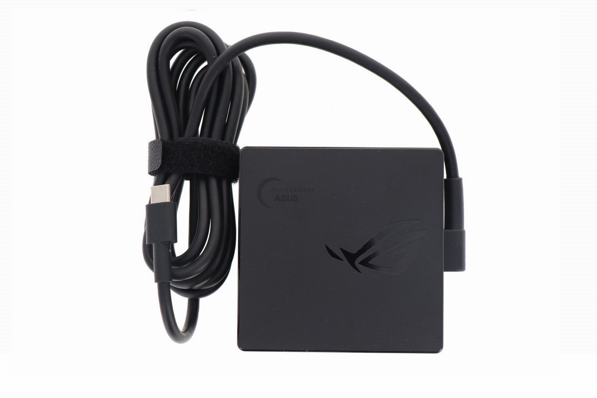输出接口线缆是通用的USB-C接头,支持100W PD快充输出,根据官方支持列表,适用于G513、G533、G553、G713、G733、GA401、GA503、GU603、GV301、GX551、GX703等华硕笔记本使用。除了华硕自家笔记本外,基于USB PD通用标准,还兼容其他数码产品,具有广泛的通用性。