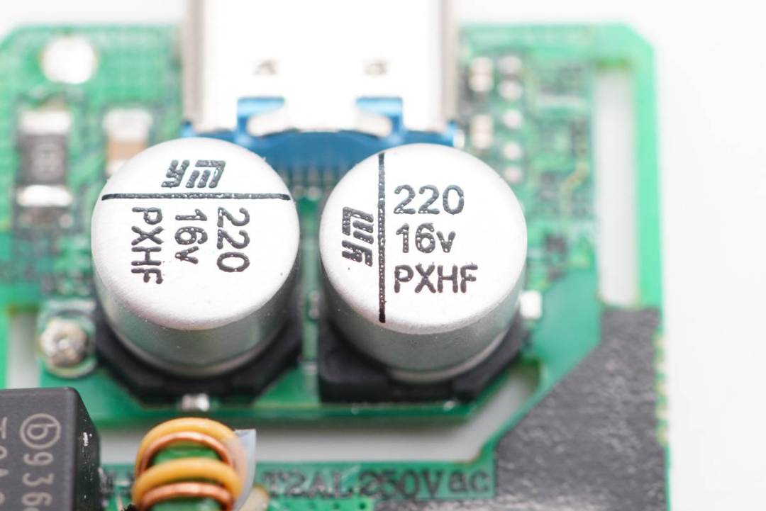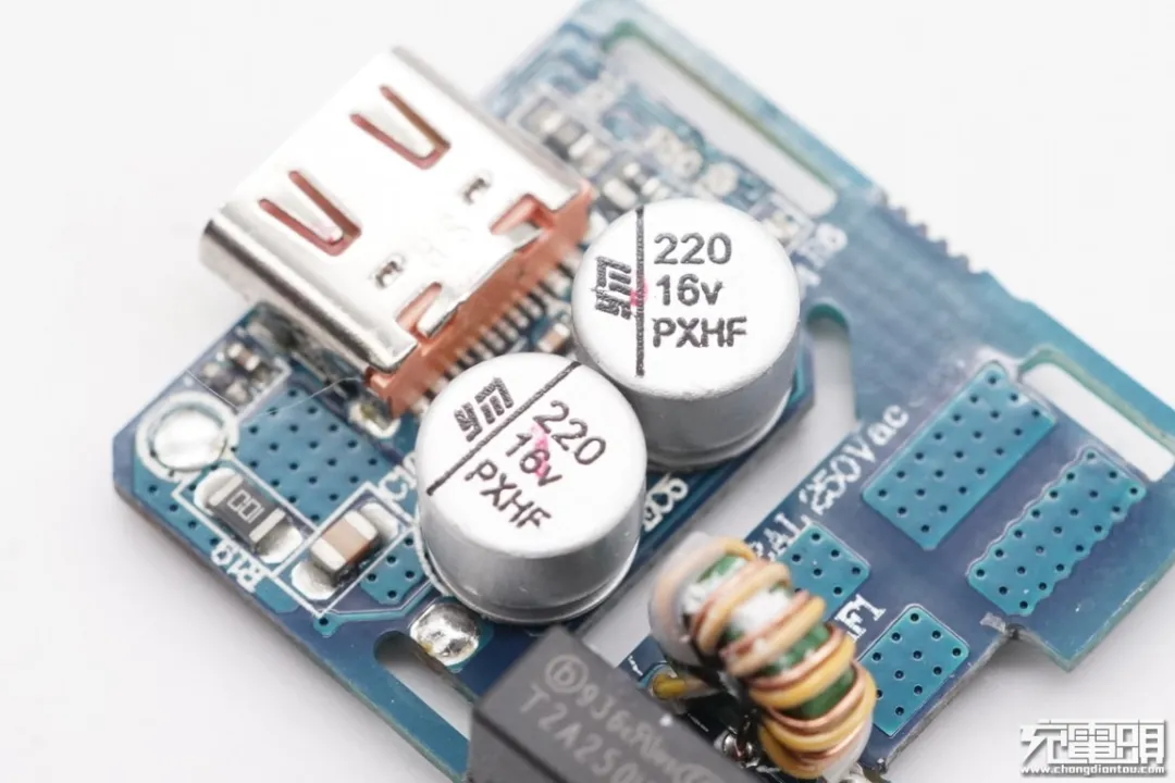 充电器输出滤波采用永铭两颗NPX系列固态电容为输出提供滤波,超低高度适配高密度迷你快充使用需求。电容规格为220μF16V,直径6.3mm,高度5.7mm,充分利用充电器内部空间。同时这款充电器初级滤波电容也采用了永铭的KCX系列快充专用电容。