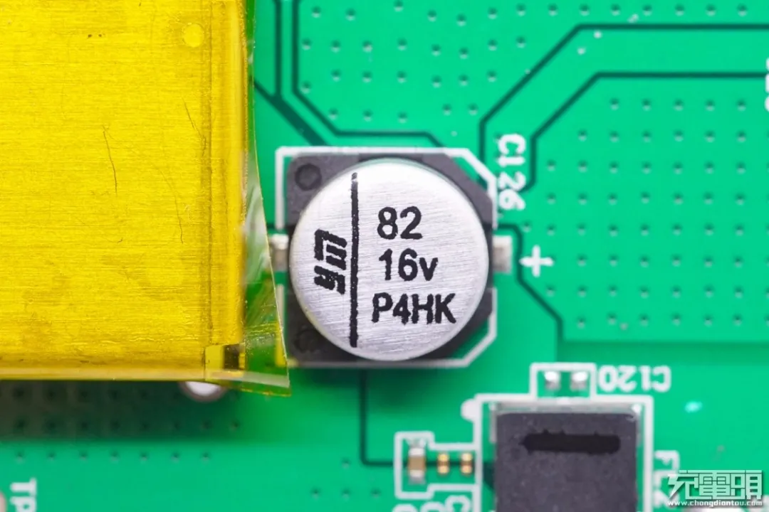 三星无线充移动电源内部采用2串电池组,内部采用两路升降压分别负责移动电源充放电和无线充供电。这款移动电源内部实用了三颗永铭VPX系列固态贴片电容,其中一颗用于USB-C输入端,一颗用于电池端与无线充升降压输入滤波,一颗用于无线充供电滤波。三颗电容均为三星定制规格,20V120μF,直径6.3mm,高度5.8mm。为移动电源提供稳定可靠的滤波。